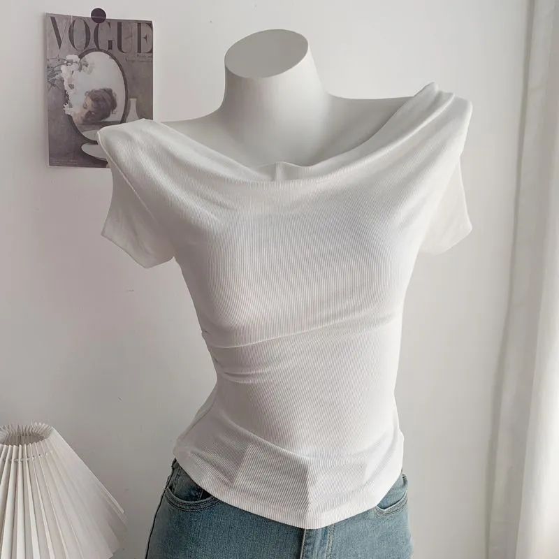 夏季褶皱不规则螺纹露肩荡领短袖t恤小众设计感纯欲辣妹上衣