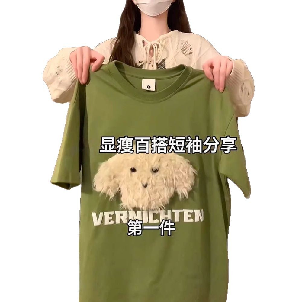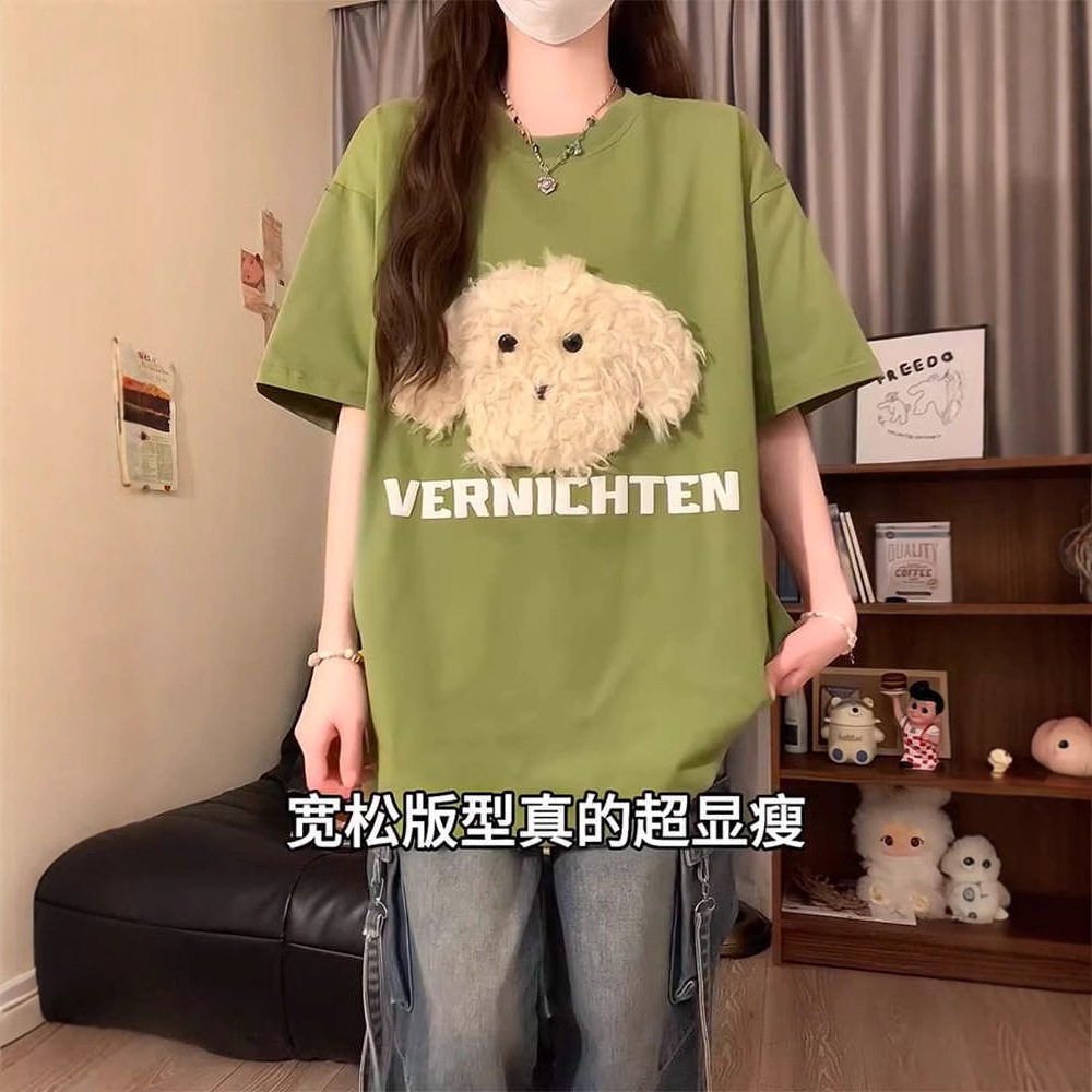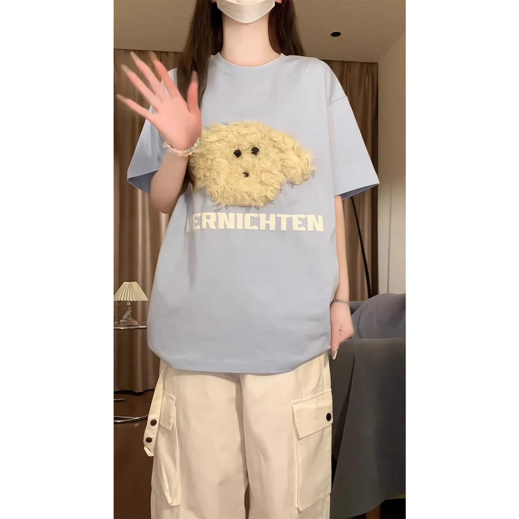 刺绣狗狗短袖T恤女夏季2025新款设计小众甜酷学院风宽松纯棉上衣