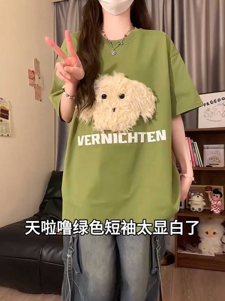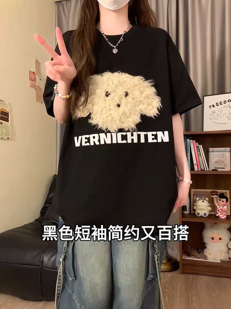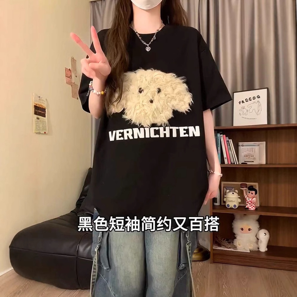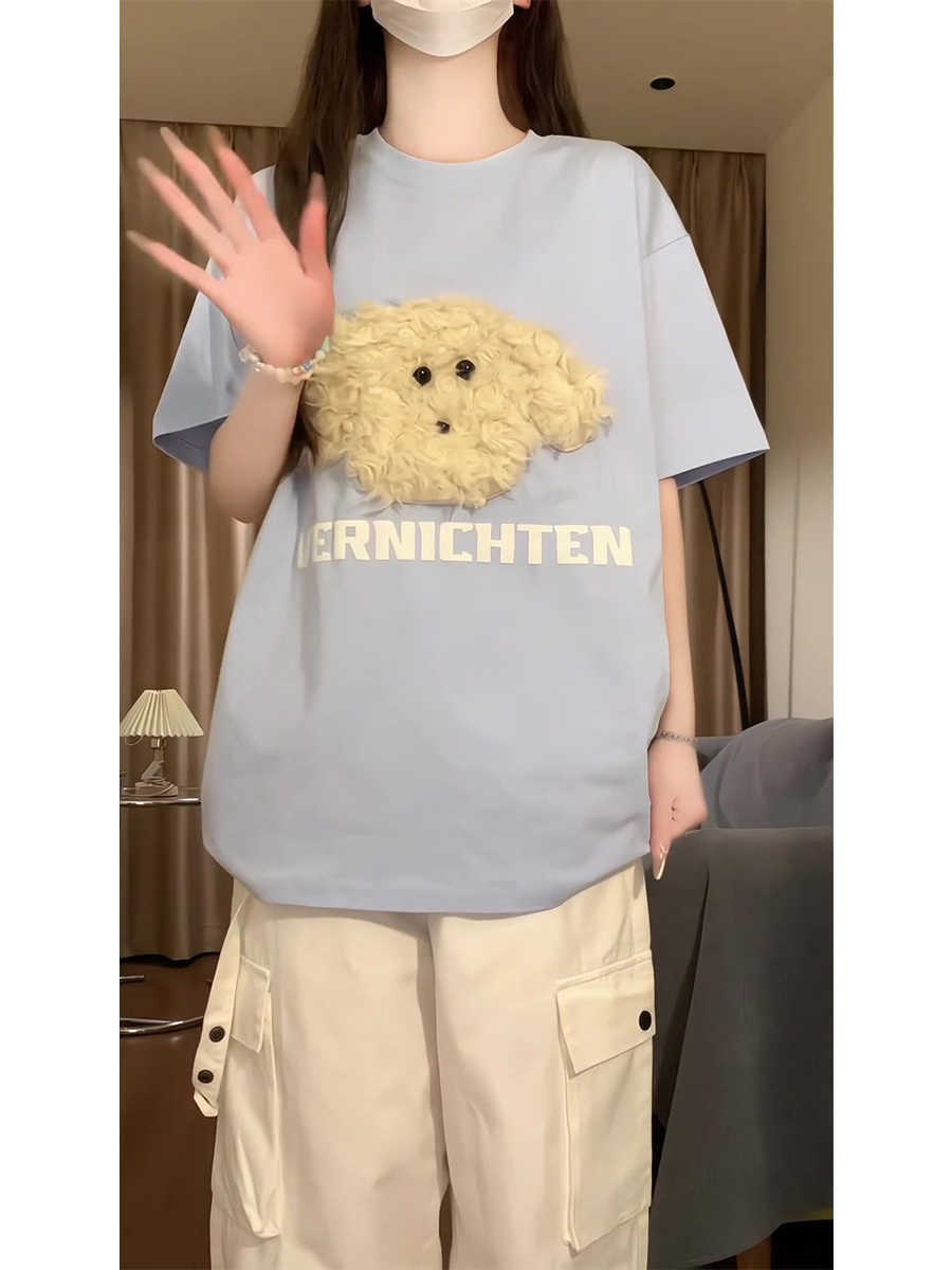 刺绣狗狗短袖T恤女夏季2025新款设计小众甜酷学院风宽松纯棉上衣