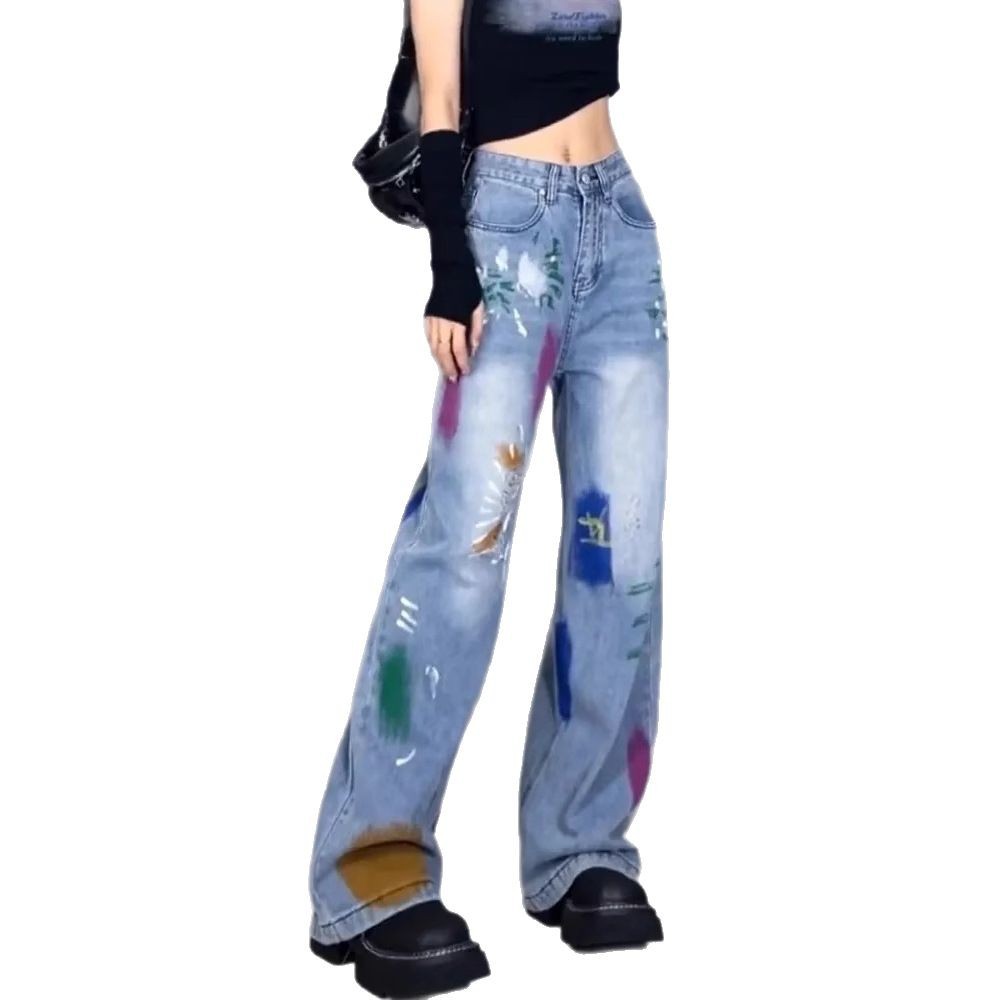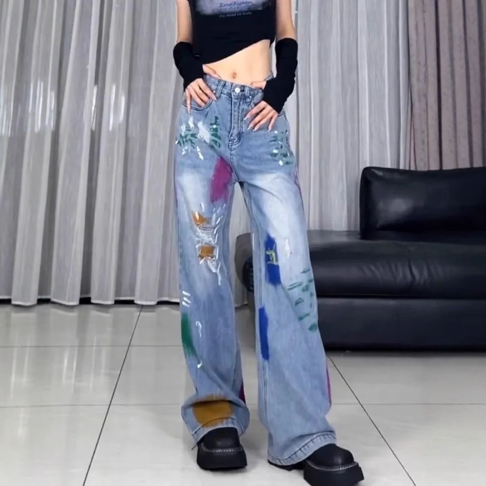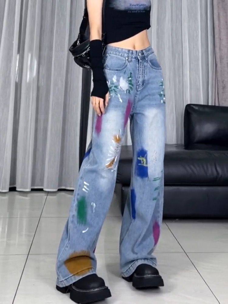 韩国东大门2025夏季新款设计感创意彩绘破洞百搭阔腿牛仔裤女