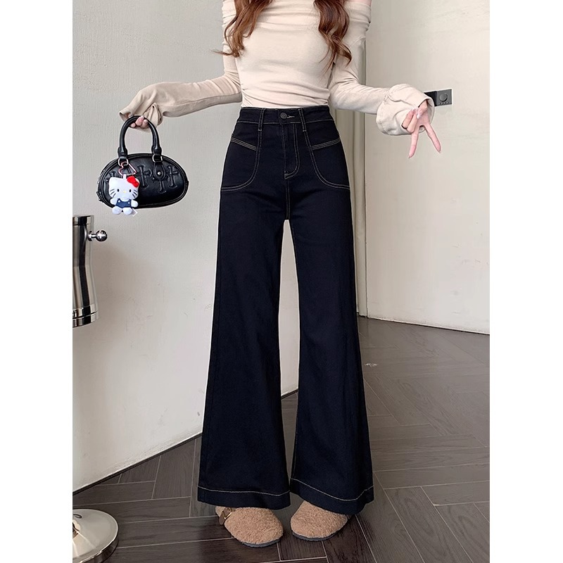 2025春季黑色微喇叭牛仔裤女胖mm梨形身材宽松高腰显瘦直筒阔腿裤
