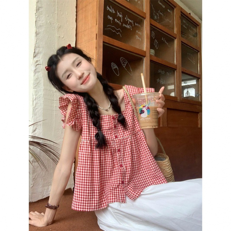 小飞袖上衣春韩系少女可爱女夏方领宽松百搭露背小个子娃娃衫