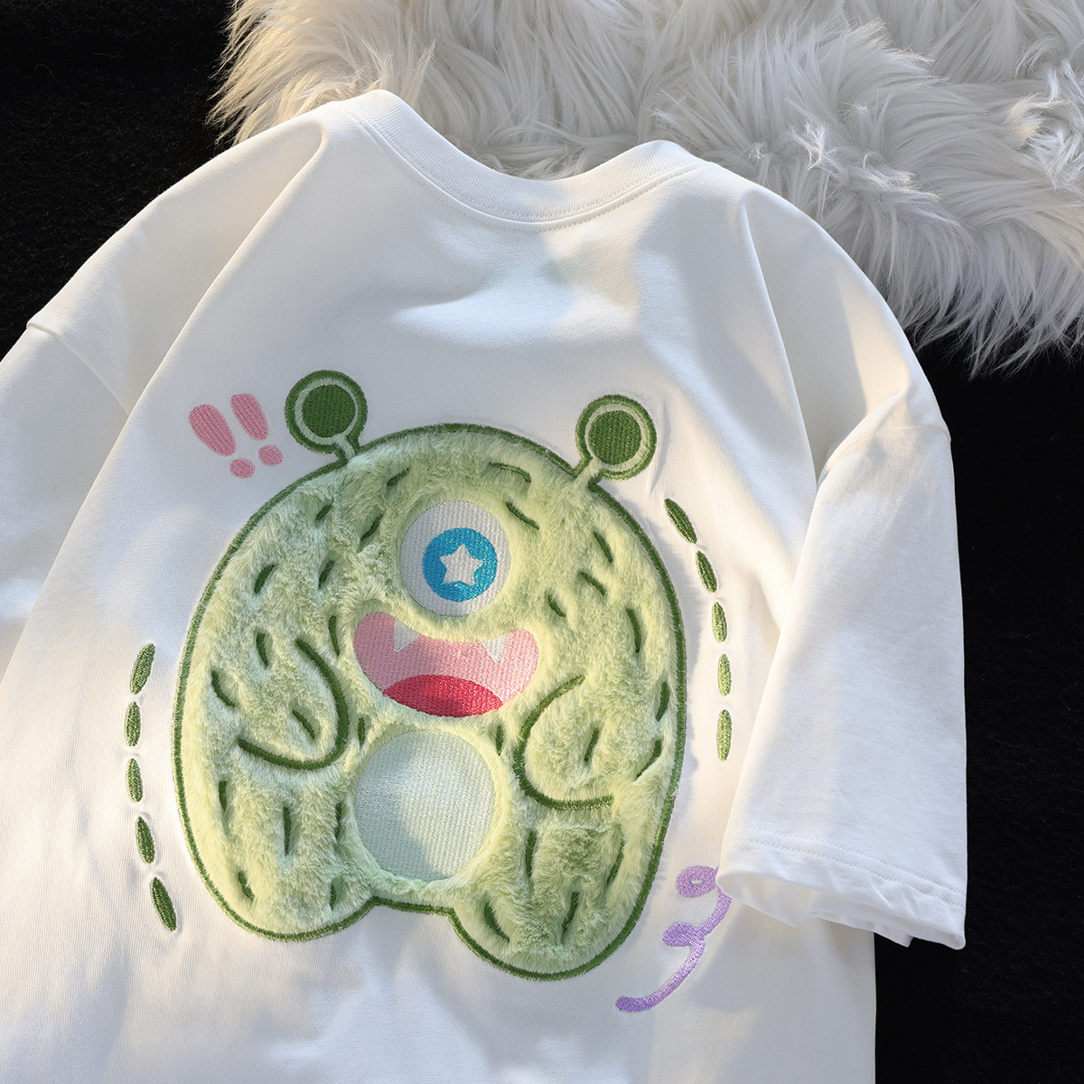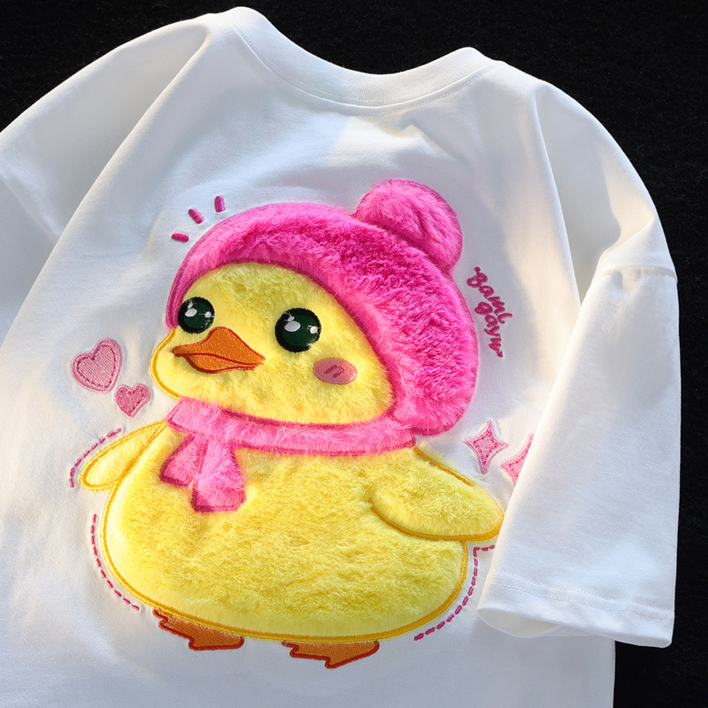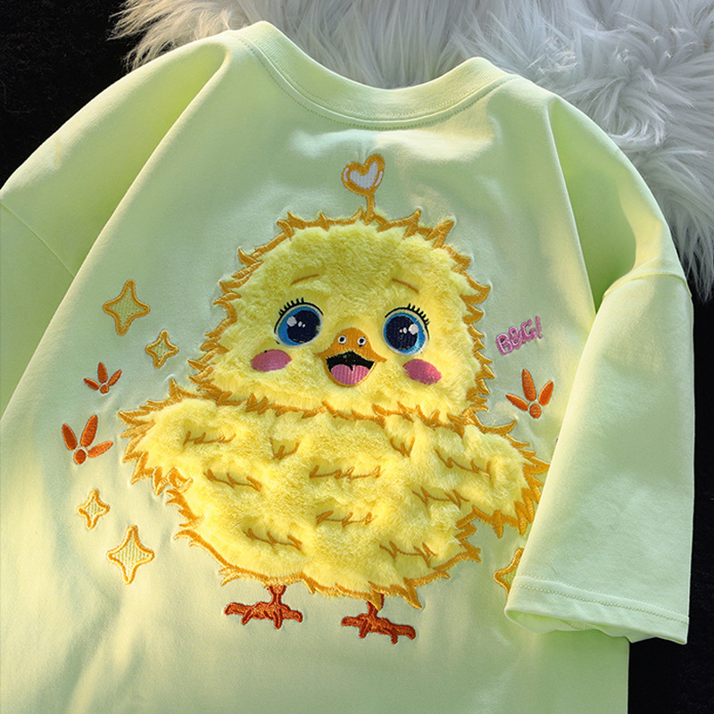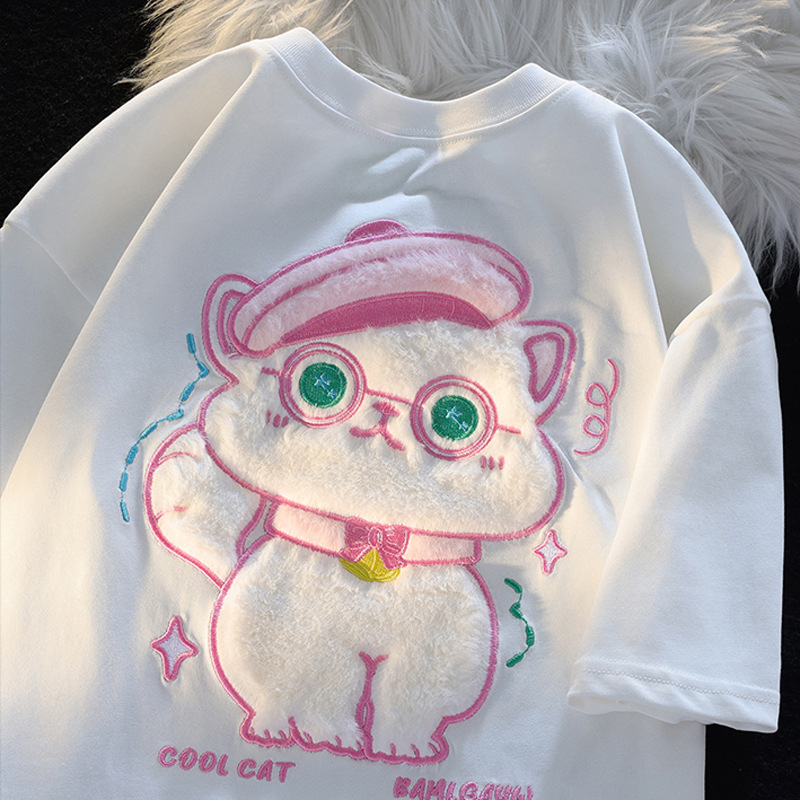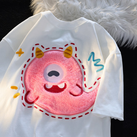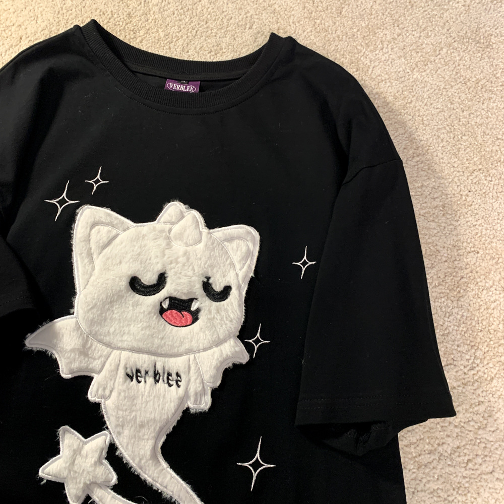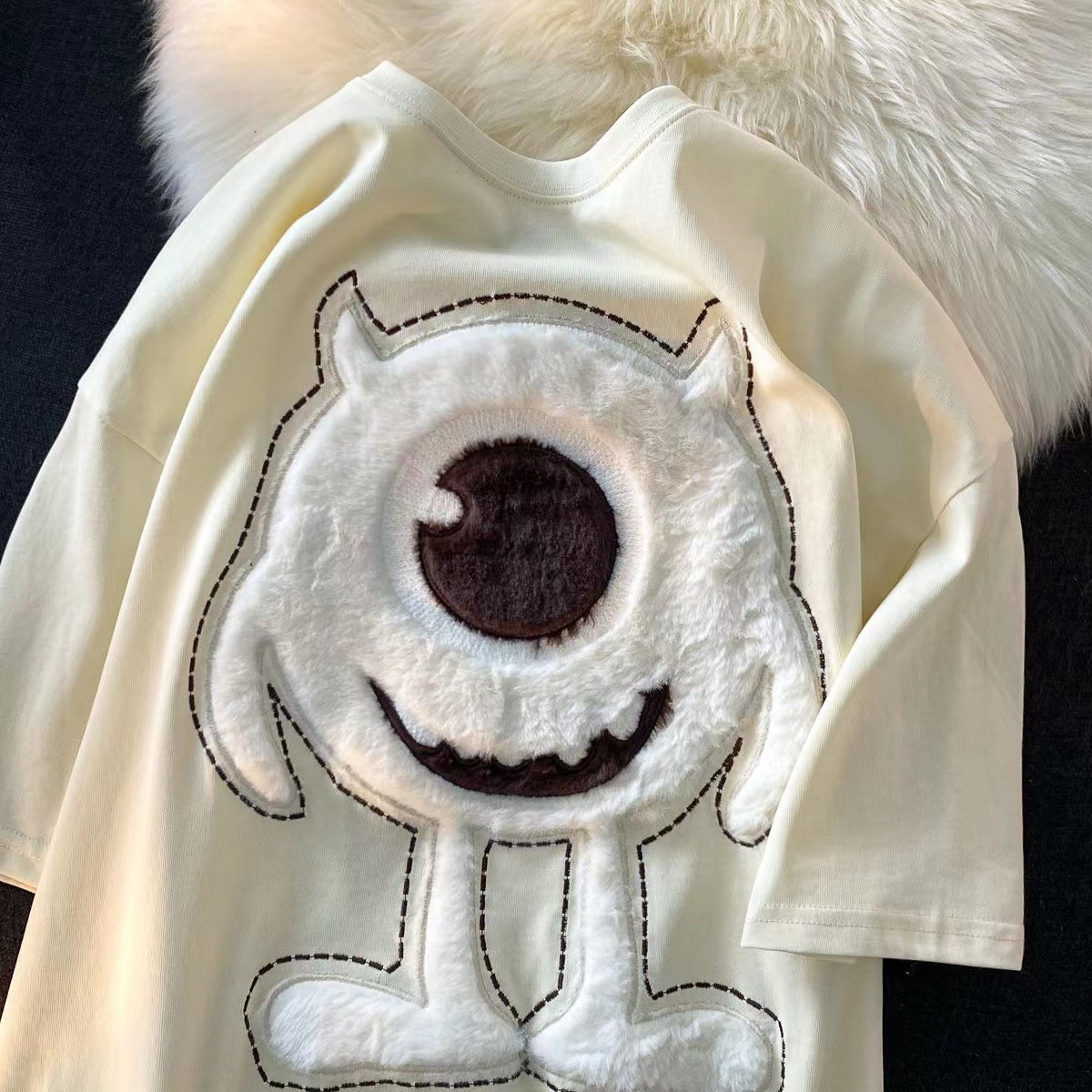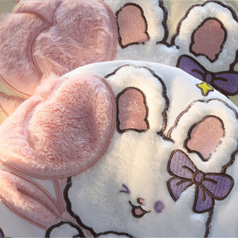 植绒甜美毛绒兔子纯棉短袖t恤女宽松可爱日系chic独特上衣超好看