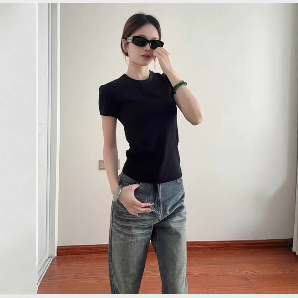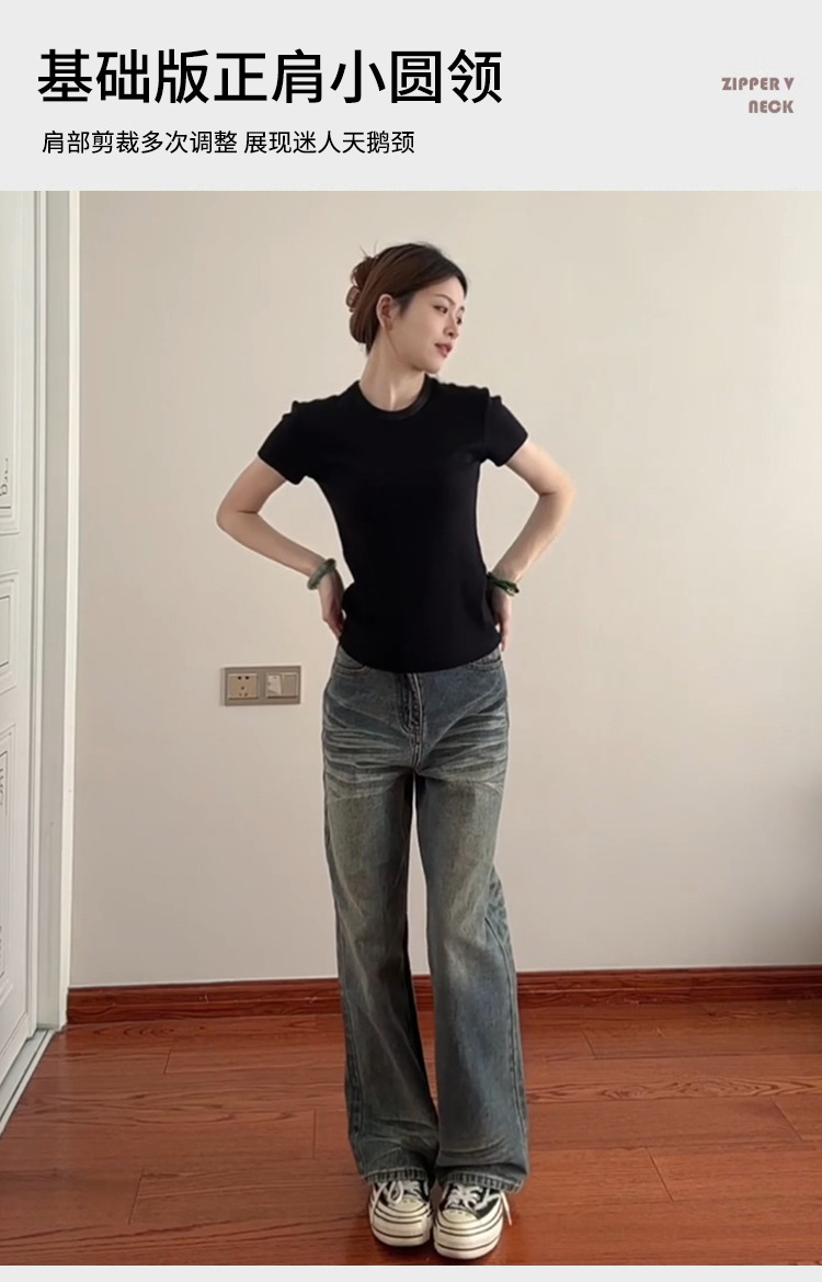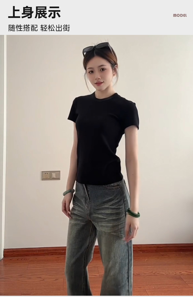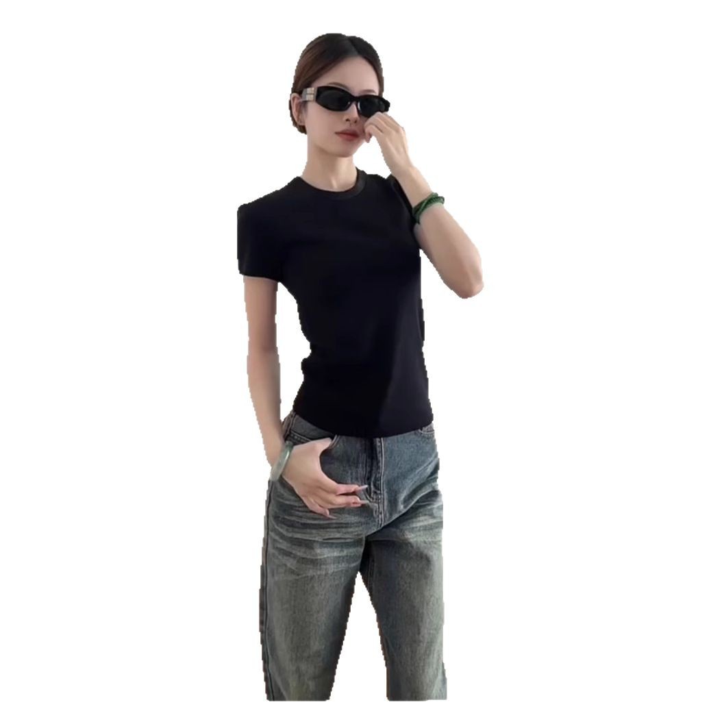 黑色短袖女t恤2025新款夏季正肩圆领半袖修身上衣白内搭打底紧身