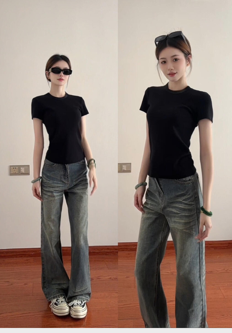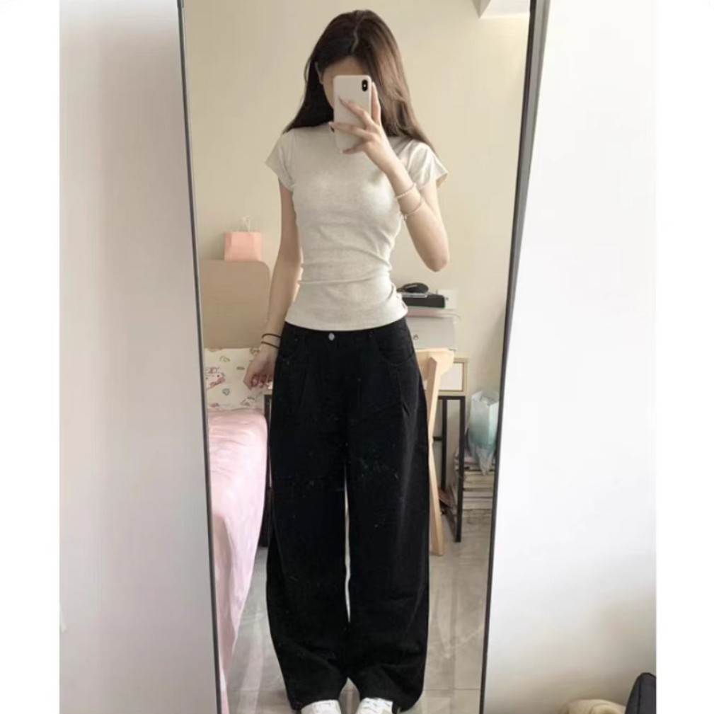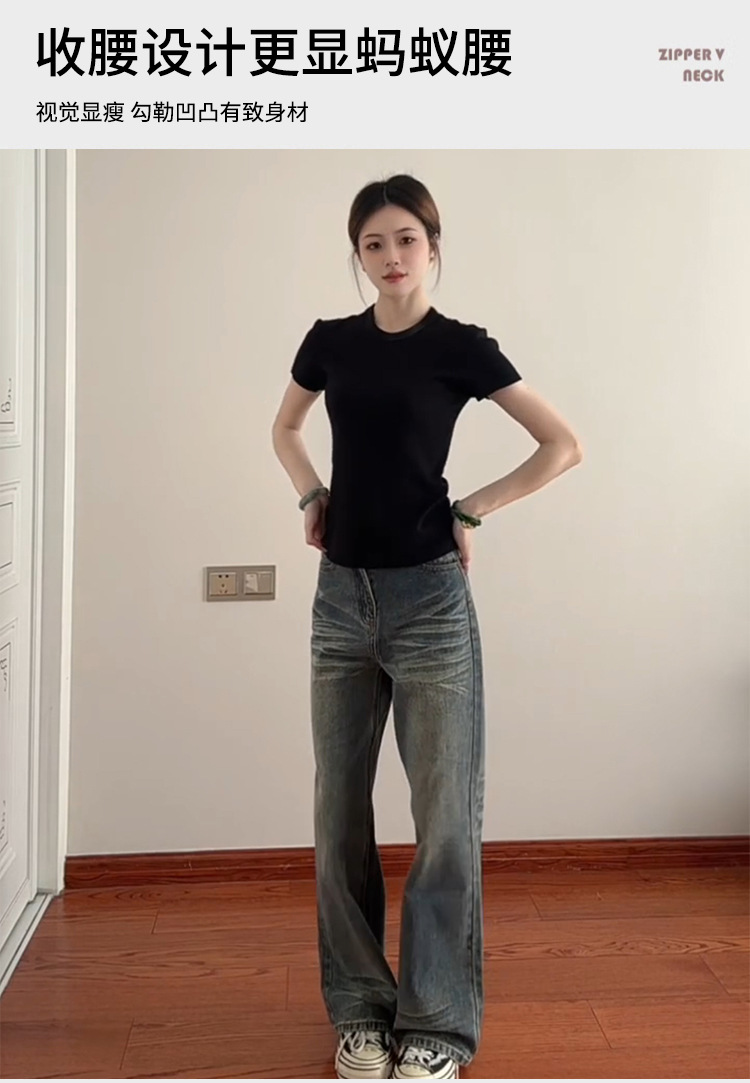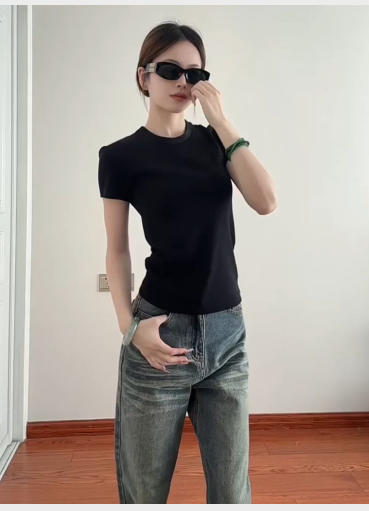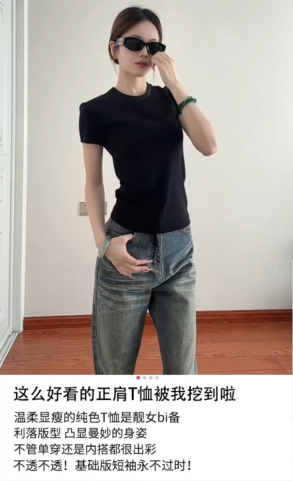 黑色短袖女t恤2025新款夏季正肩圆领半袖修身上衣白内搭打底紧身