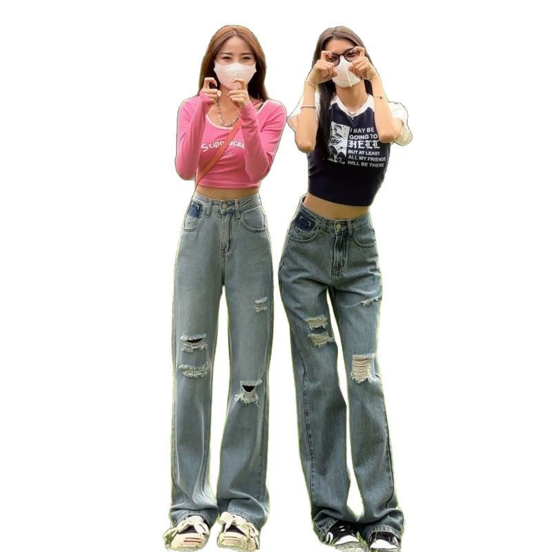 2025年新款直筒牛仔裤女春夏撞色显瘦设计感宽松高腰阔腿裤子