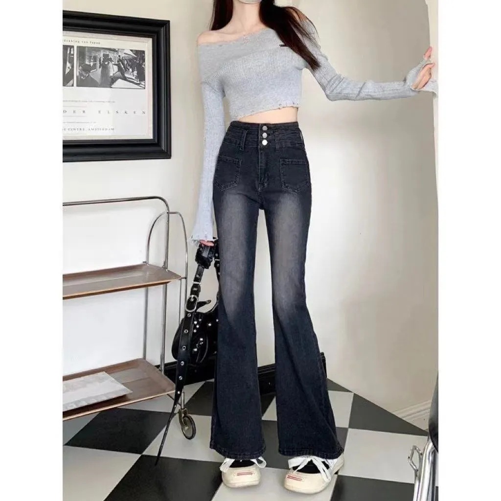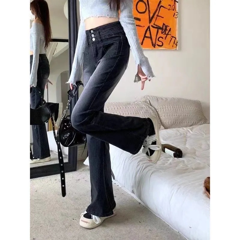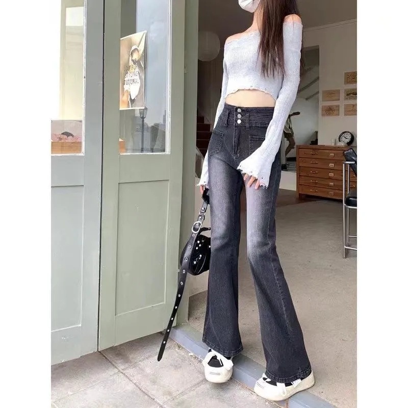 新款2025春季高弹力三排扣微喇叭牛仔裤复古烟灰色高腰直筒拖地裤
