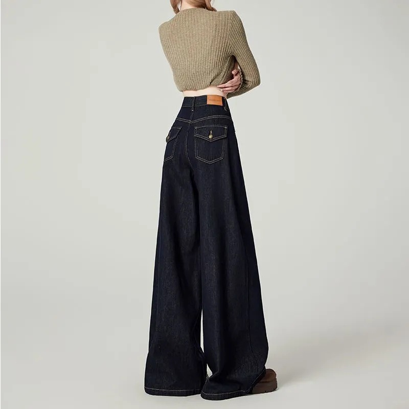 流行深蓝垂感阔腿牛仔裤女美式高腰韩版梨形穿搭拖地老爹长裤
