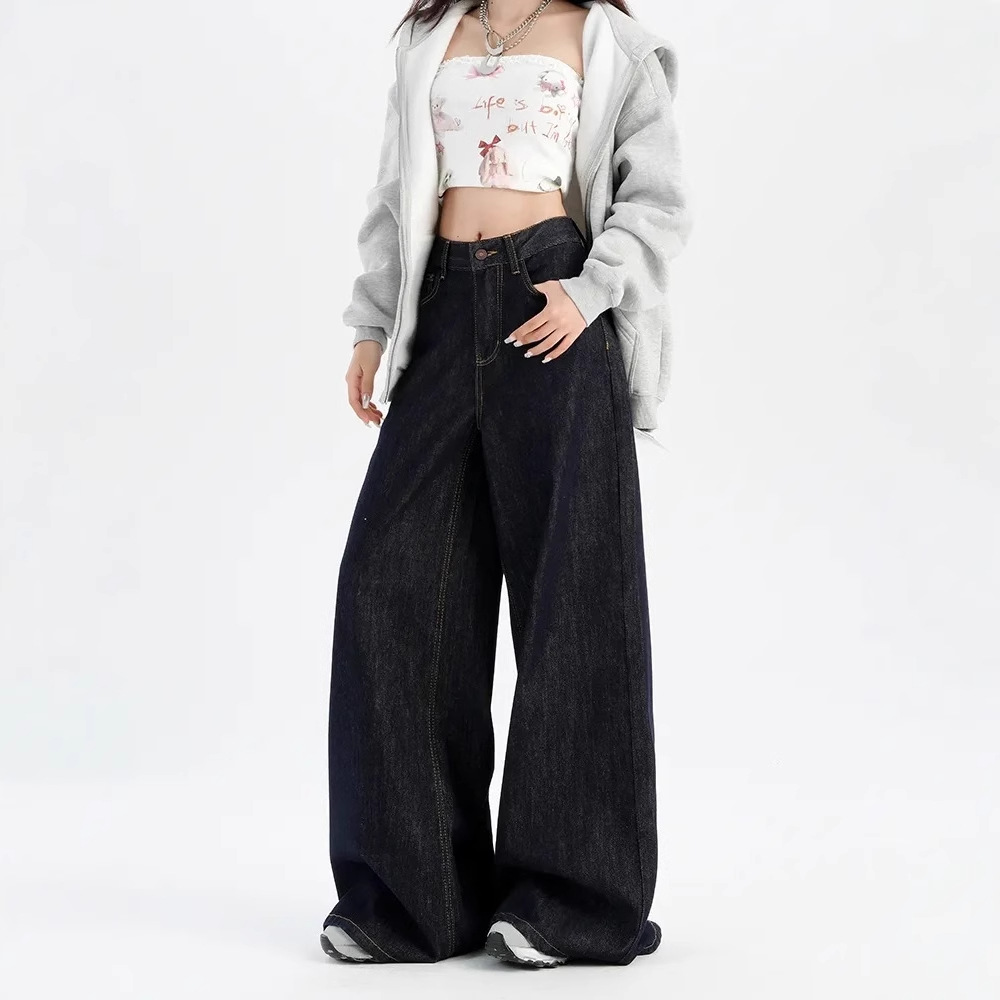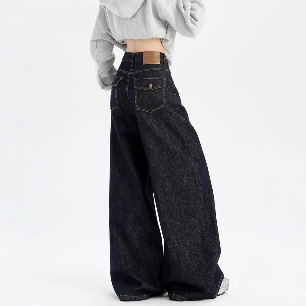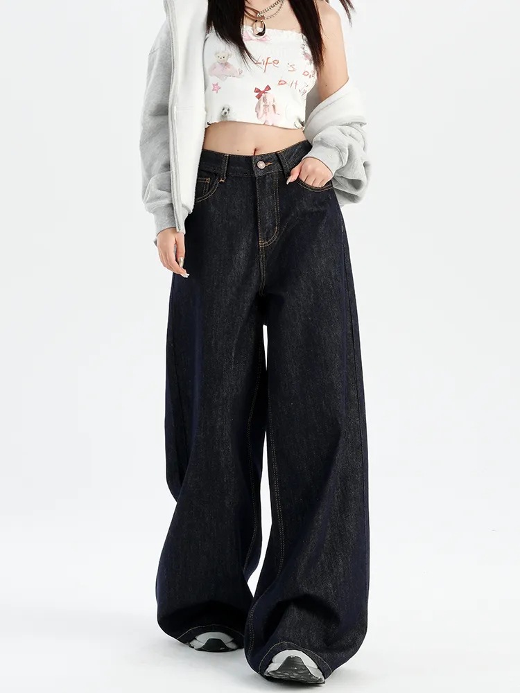 美式深蓝不掉色阔腿牛仔裤女春秋季新款高腰显瘦宽松直筒慵懒垂感