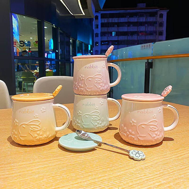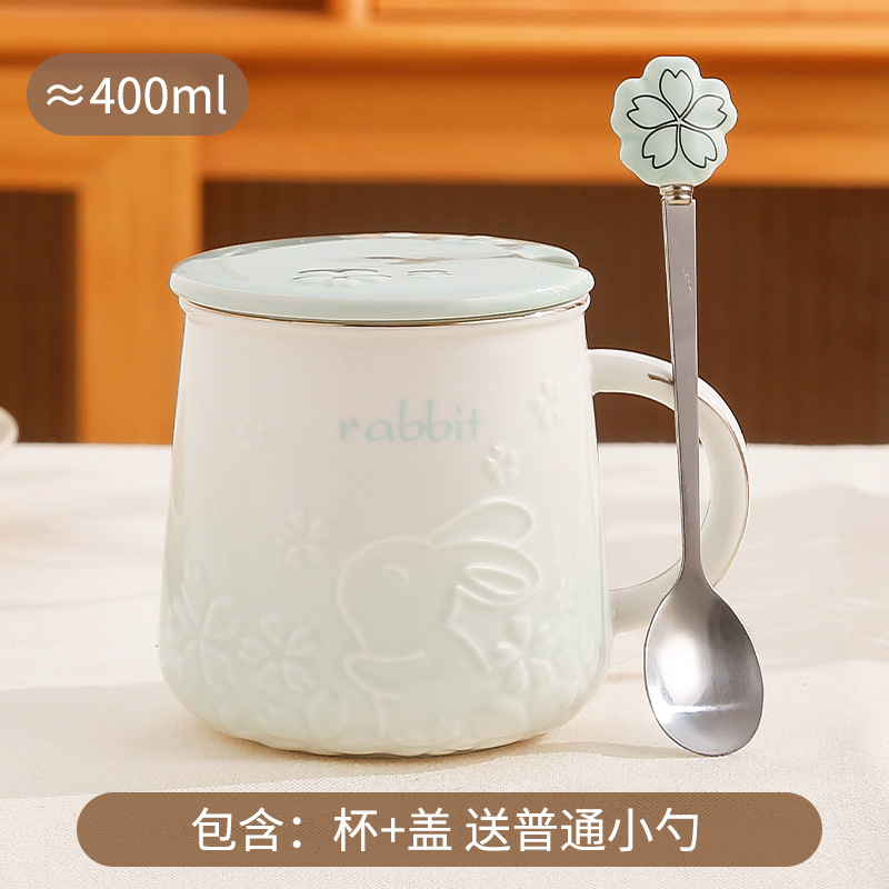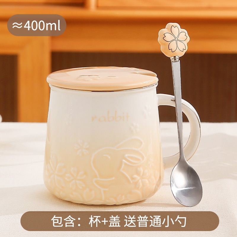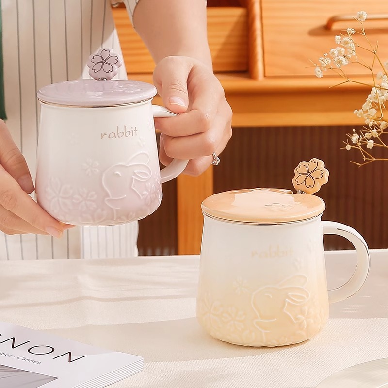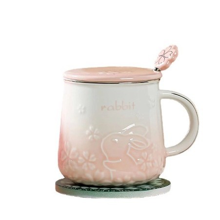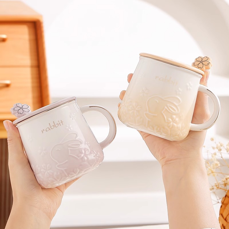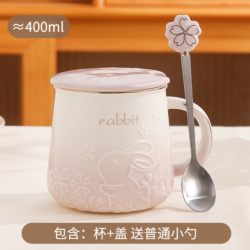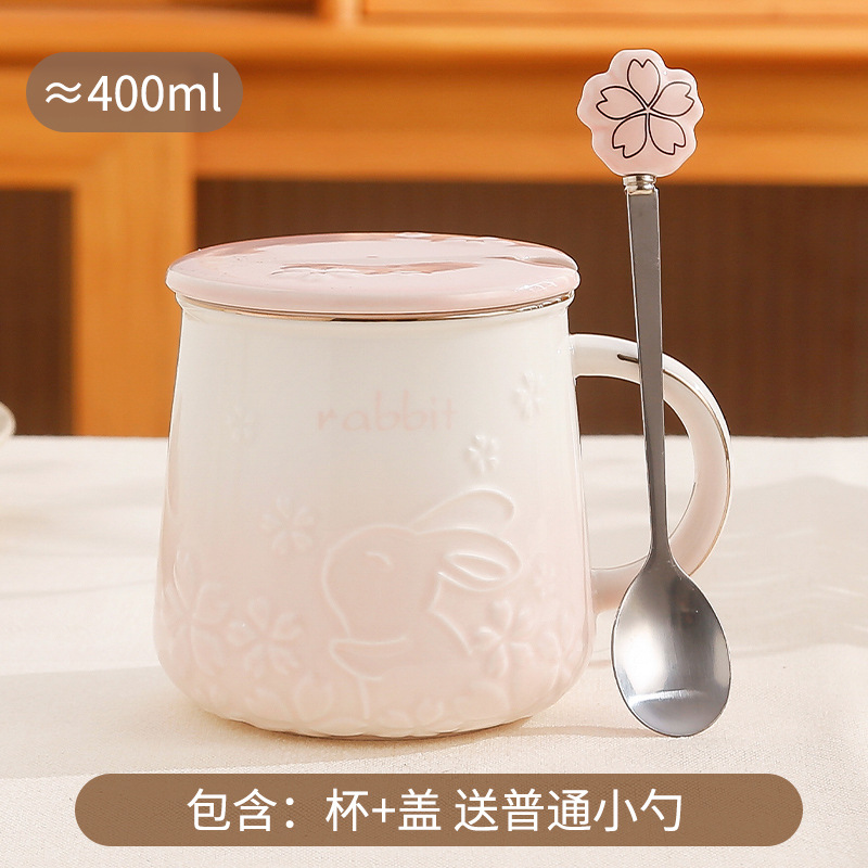 樱花浮雕兔子杯子马克杯带盖勺高颜值陶瓷水杯办公室咖啡杯早餐杯