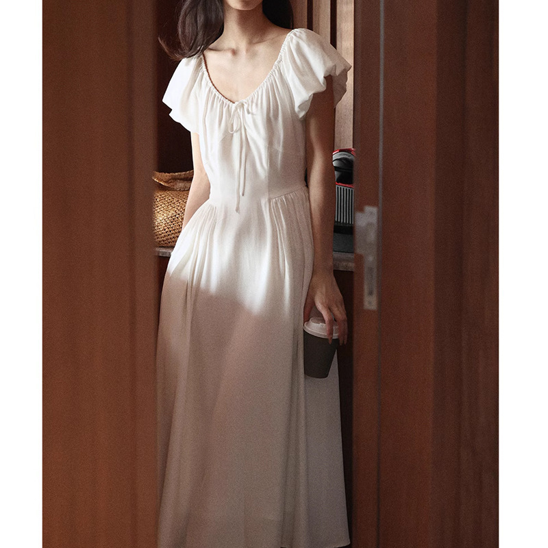 法式复古V领系带连衣裙女夏季新款小众设计显瘦茶歇仙女裙子