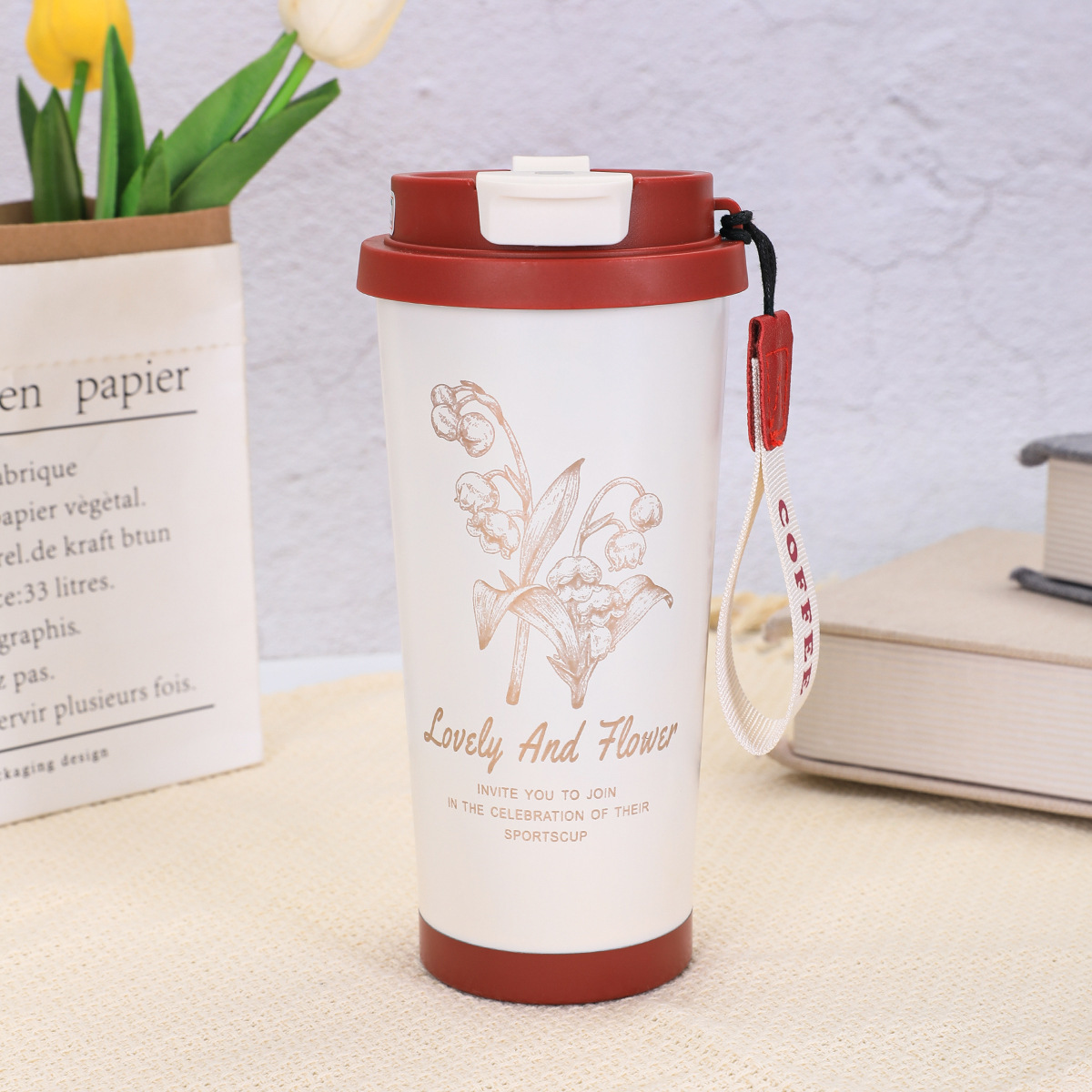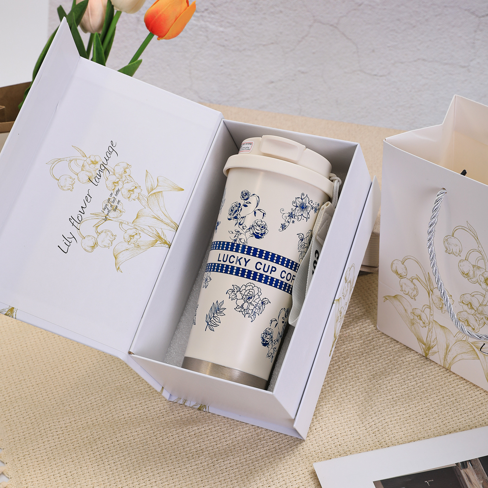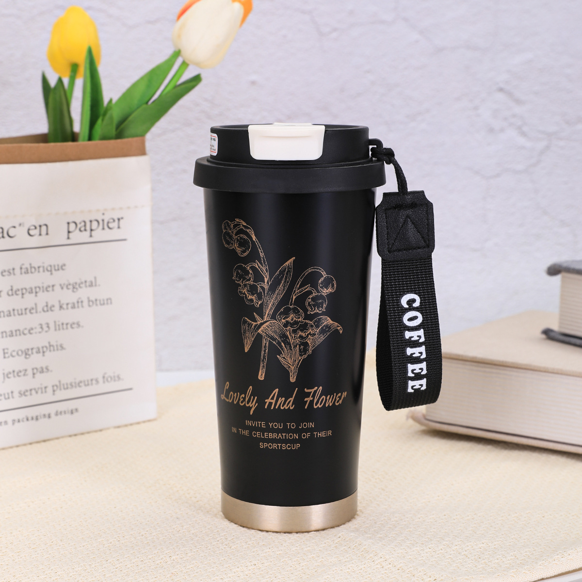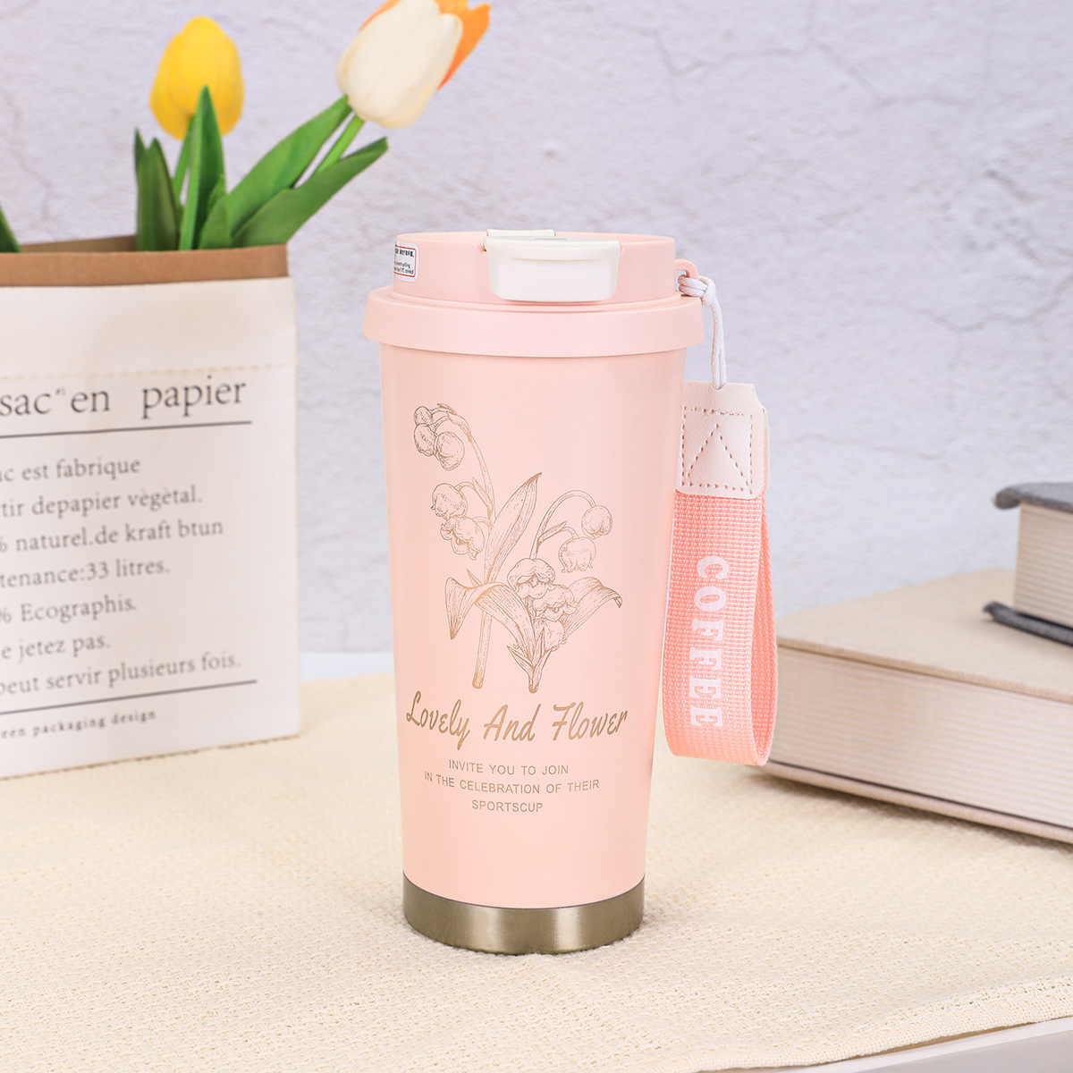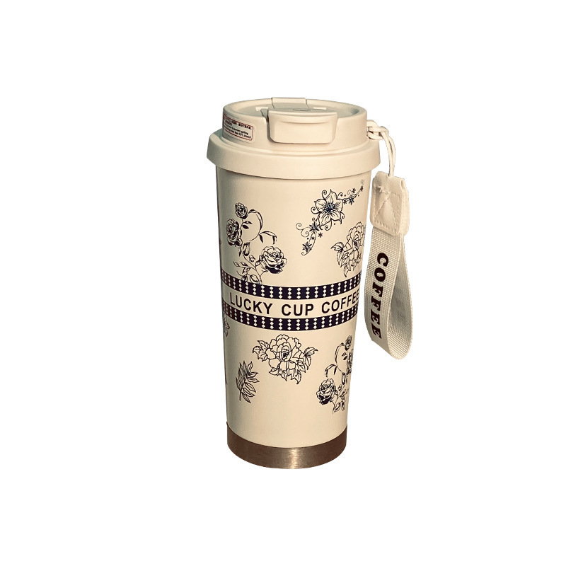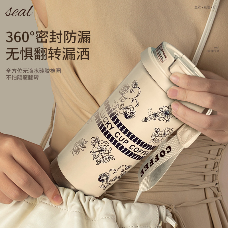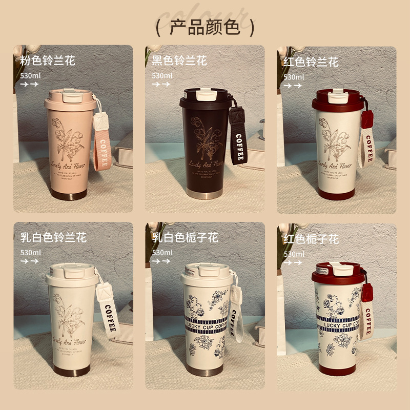 316不锈钢铃兰花咖啡杯高颜值男女真空保温杯轻奢双层提绳吸管杯