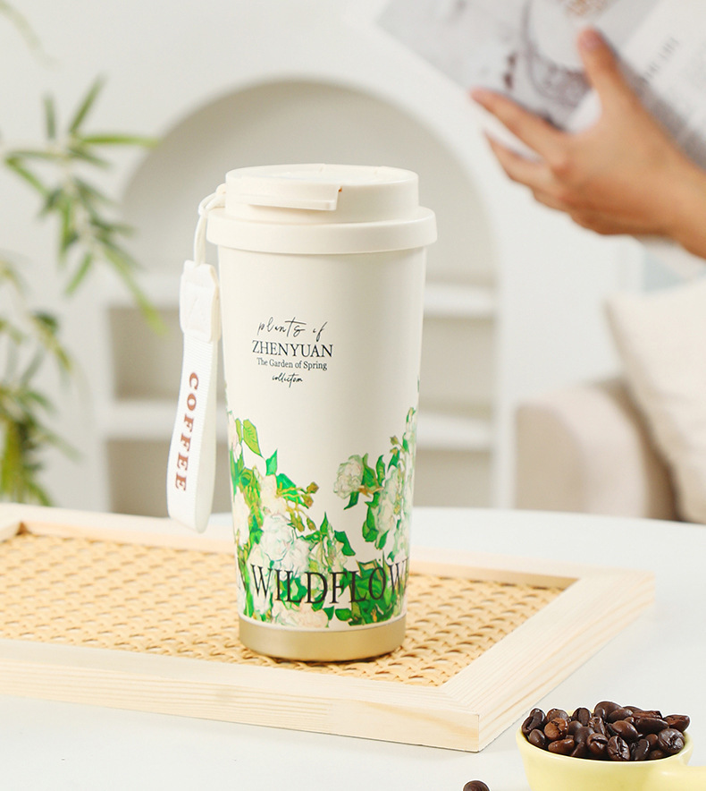 高档花朵咖啡杯316不锈钢高颜值保温杯女生便携国风双饮水杯