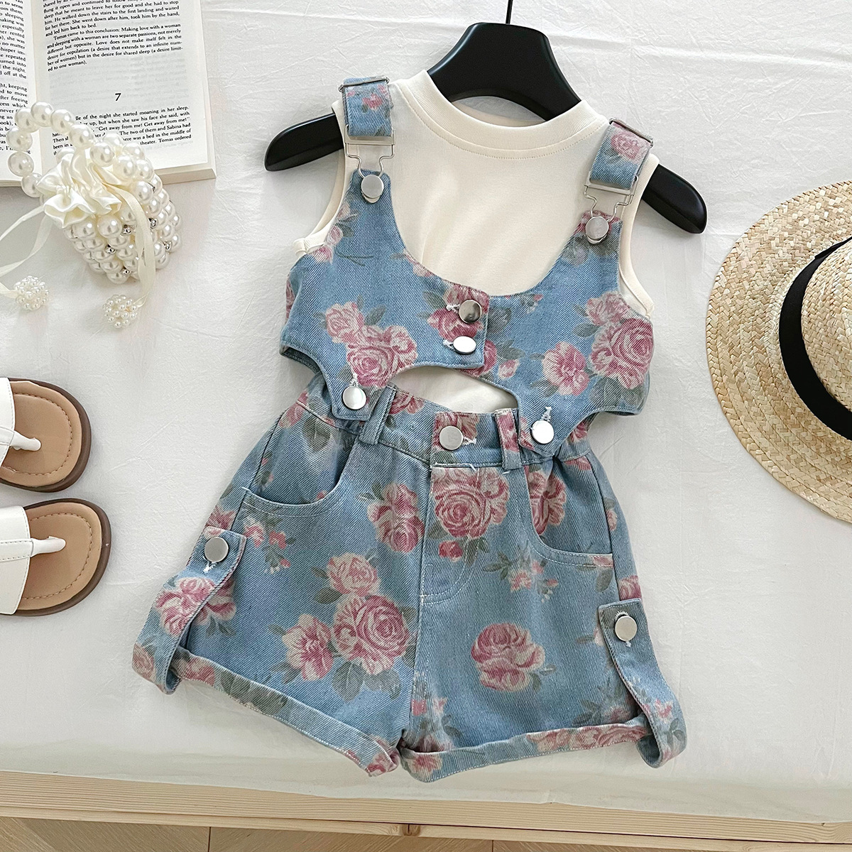 女童套装2025夏季新款背带牛仔打底衫牛仔短裤三件套