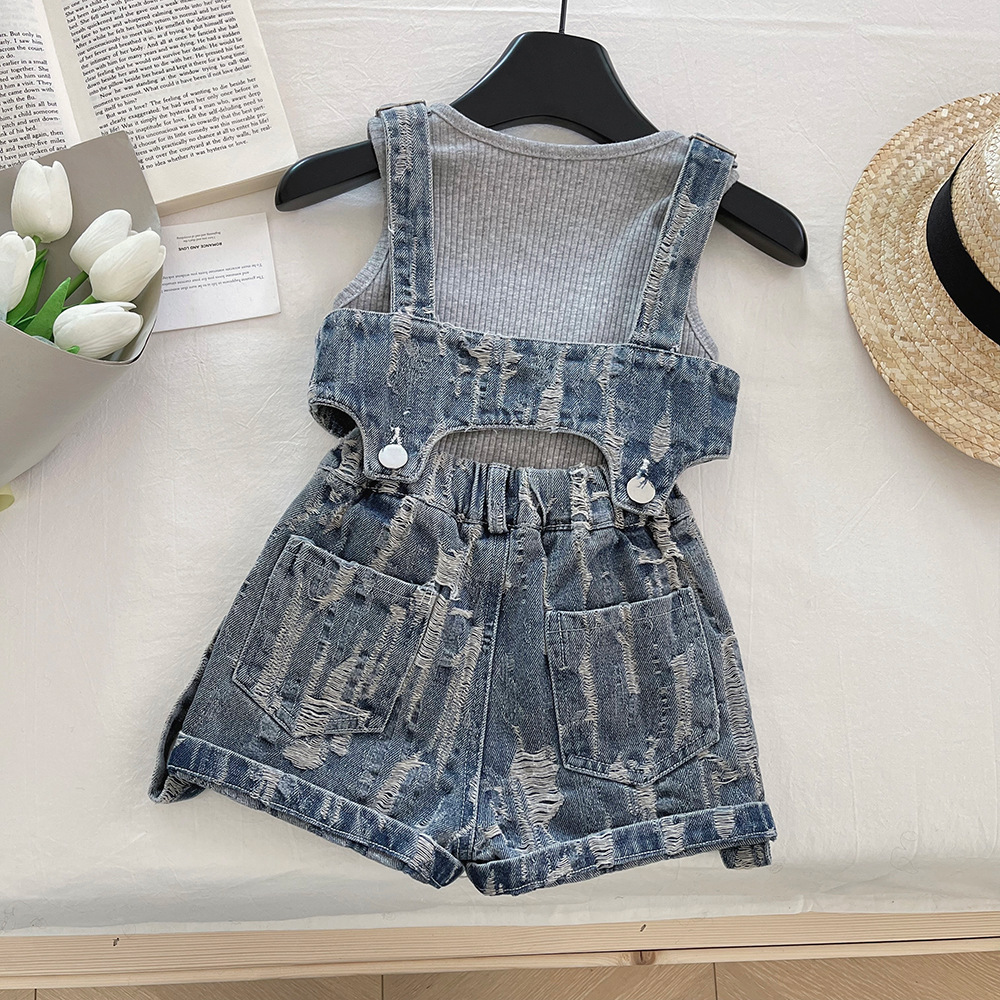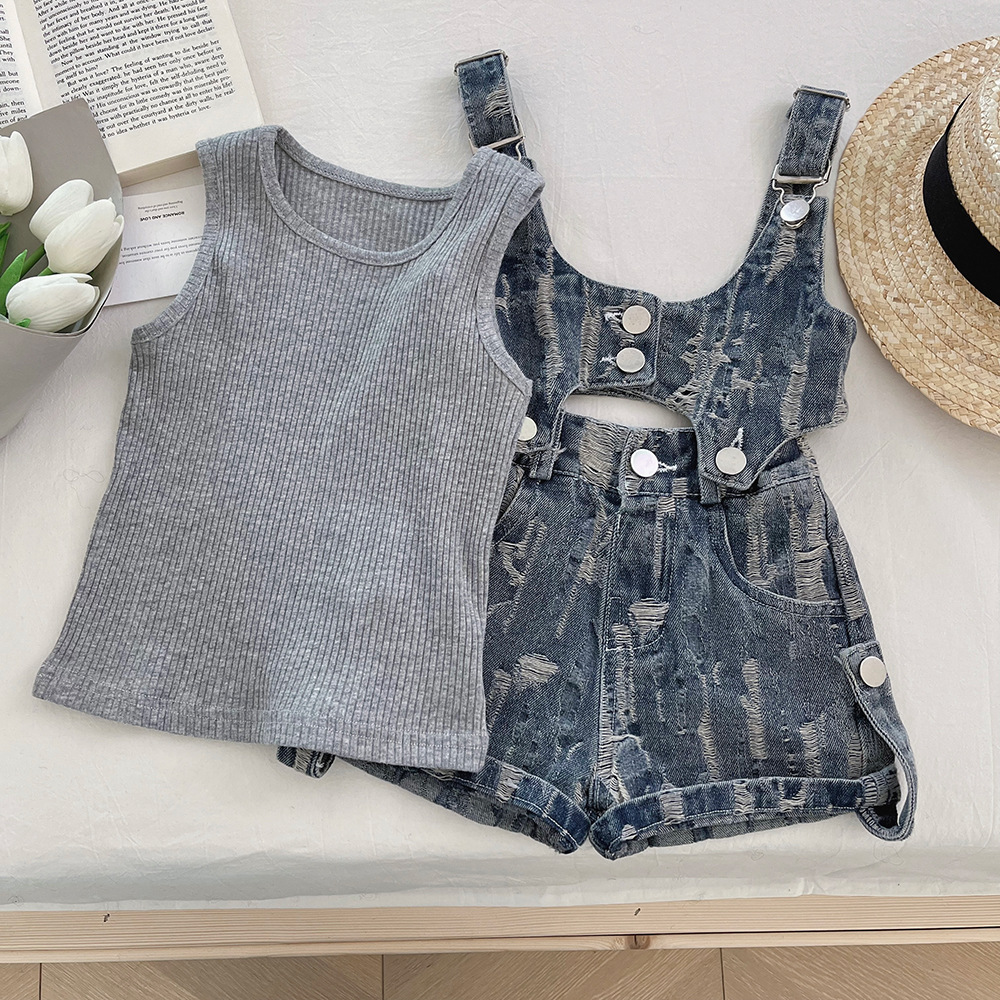 女童套装2025夏季新款韩版女宝宝背心+牛仔吊带+短裤三件套跨境