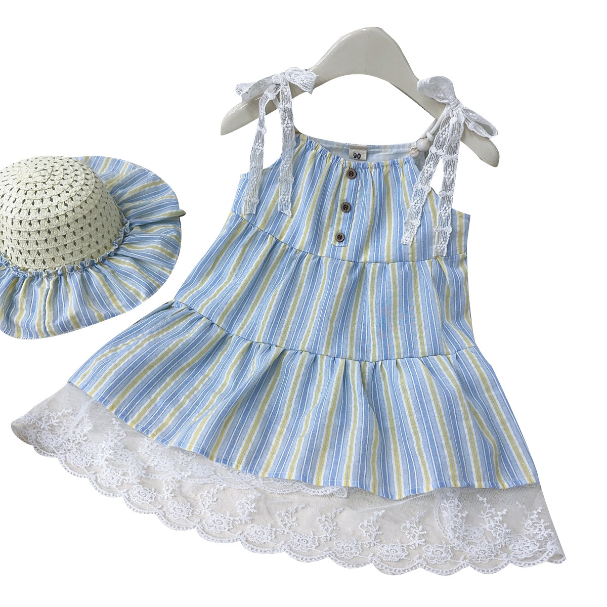女童条纹连衣裙2025夏季新款女宝宝花边蕾丝背心裙送帽子