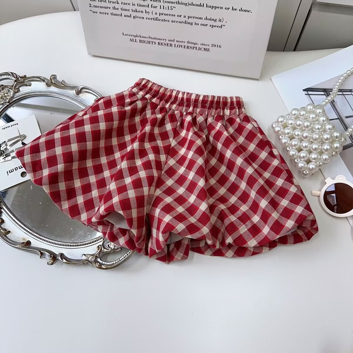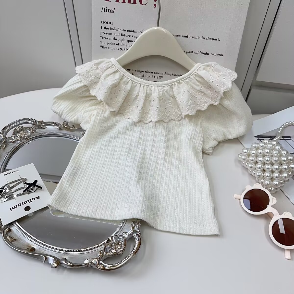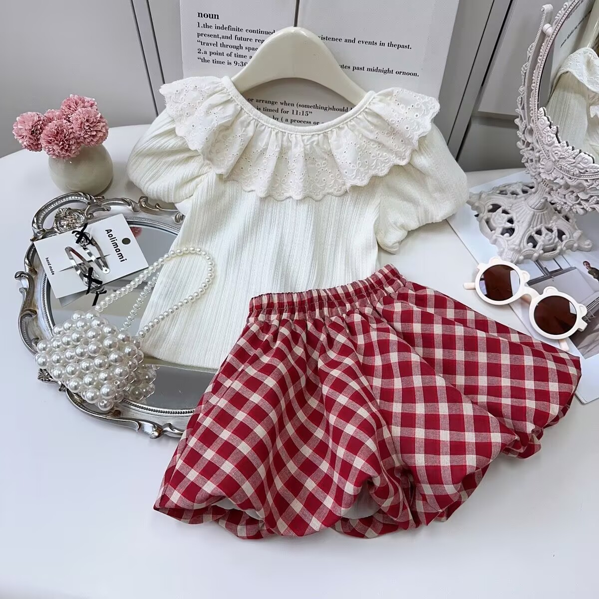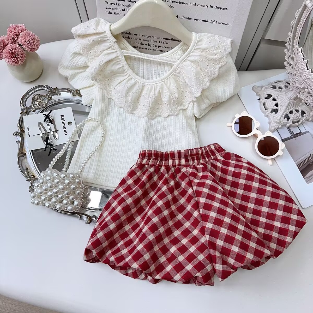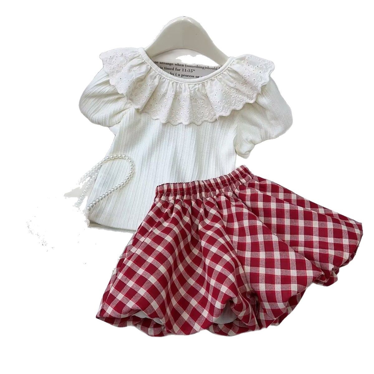 韩版女童套装夏季2025新款蕾丝翻领短袖T恤上衣格子短裤两件套
