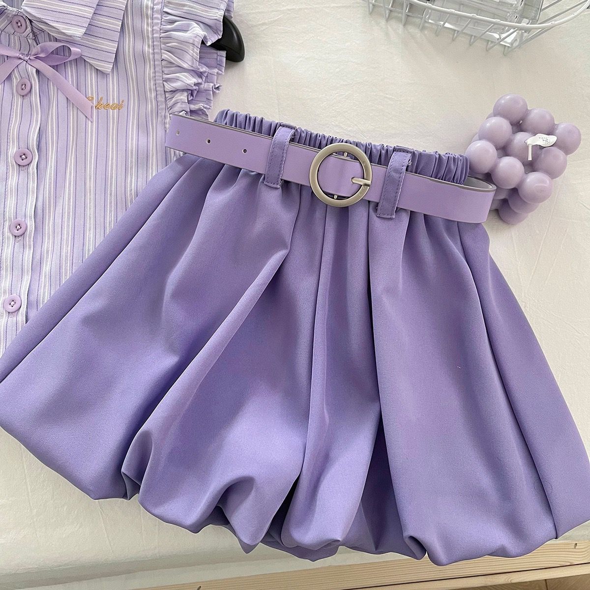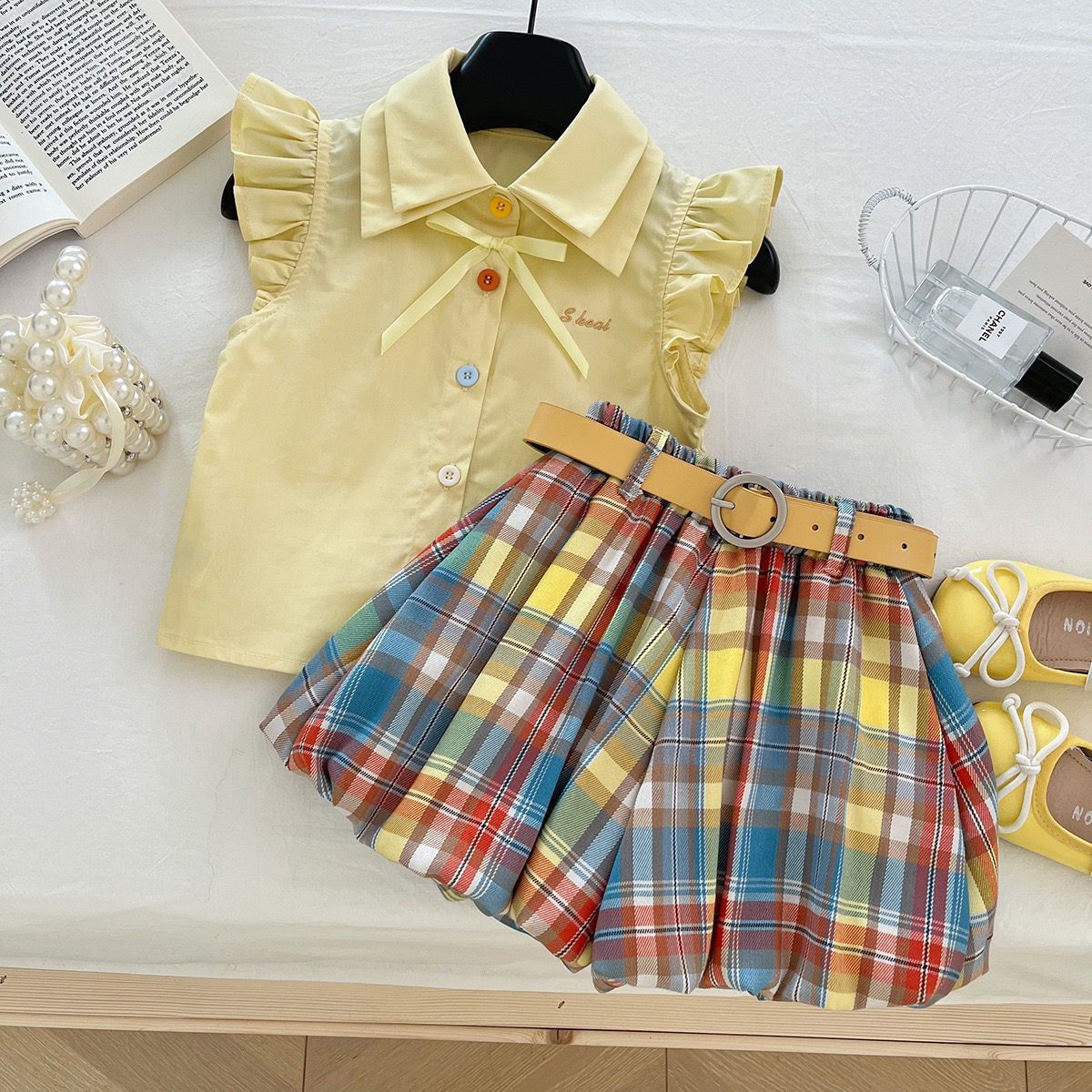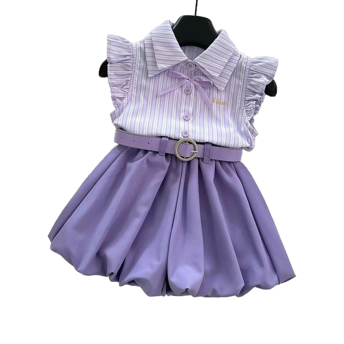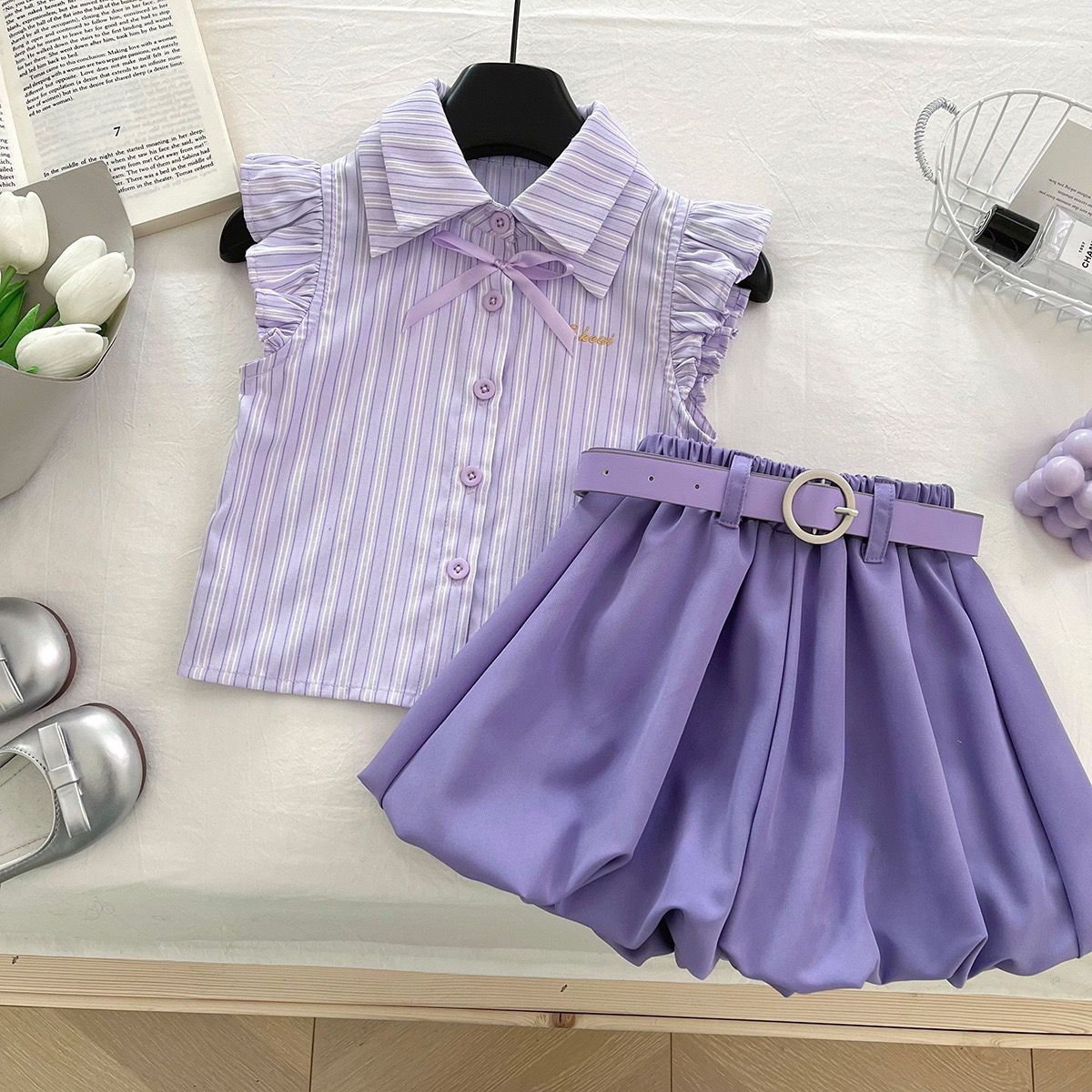 夏季女童套装2025新款韩版飞袖条纹衬衫上衣花苞短裤两件套跨境