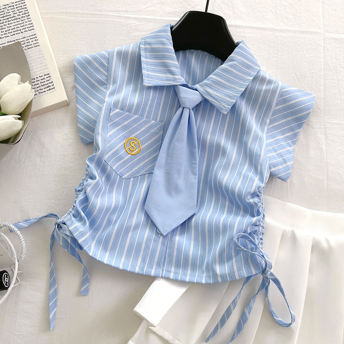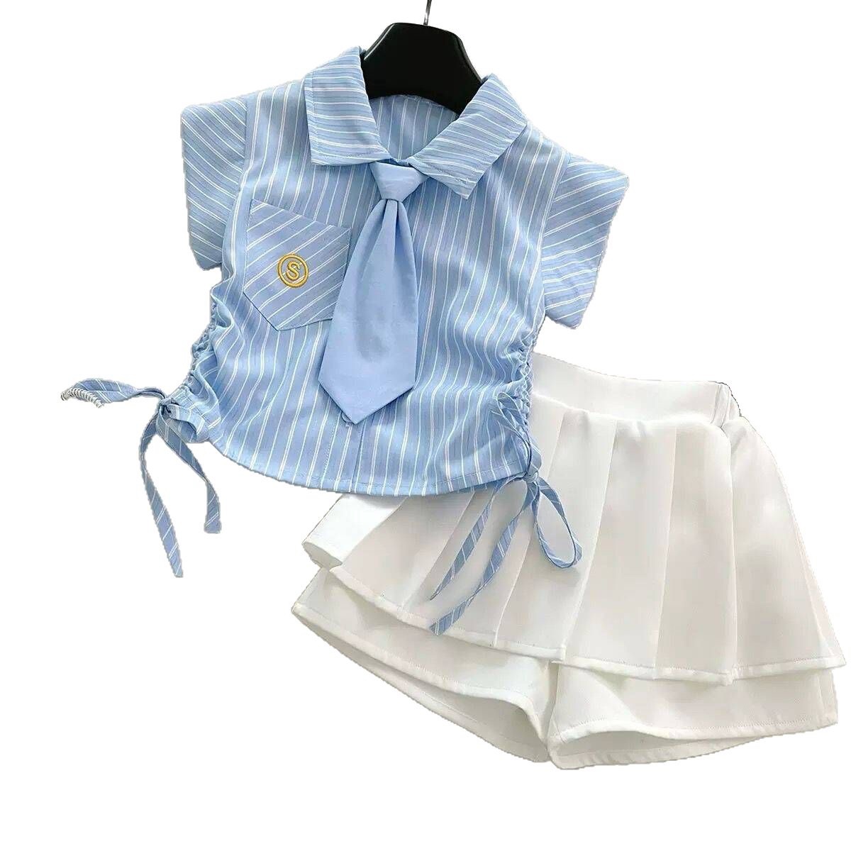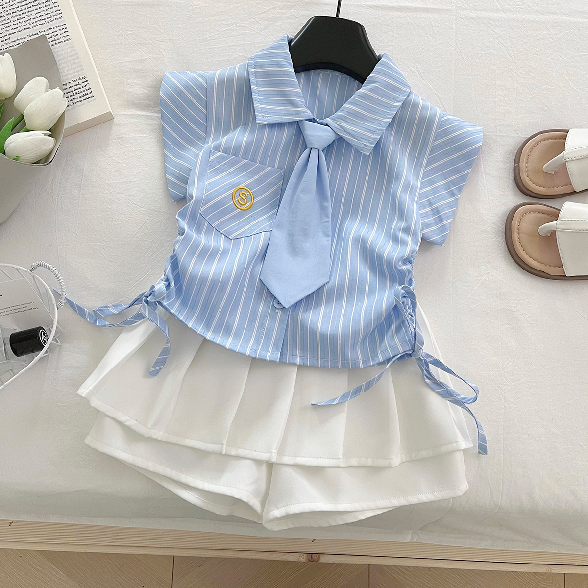 女童套装2025夏季新款韩版条纹短袖衬衫上衣百褶裙裤