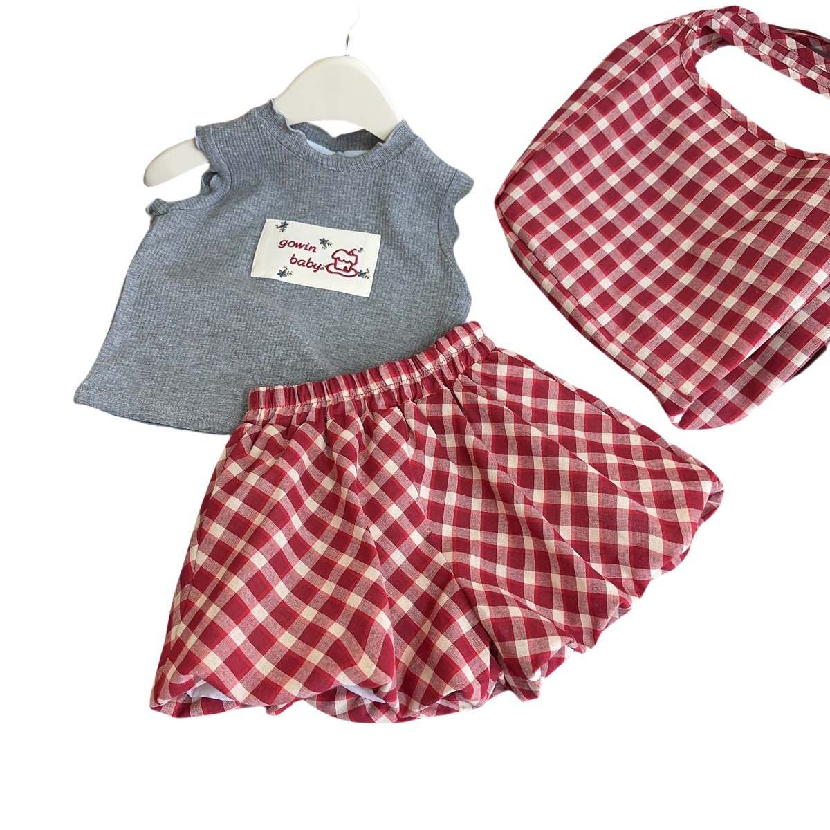 女童套装夏季2025新款卡通印花T恤衫格子短裤两件套送包包跨境