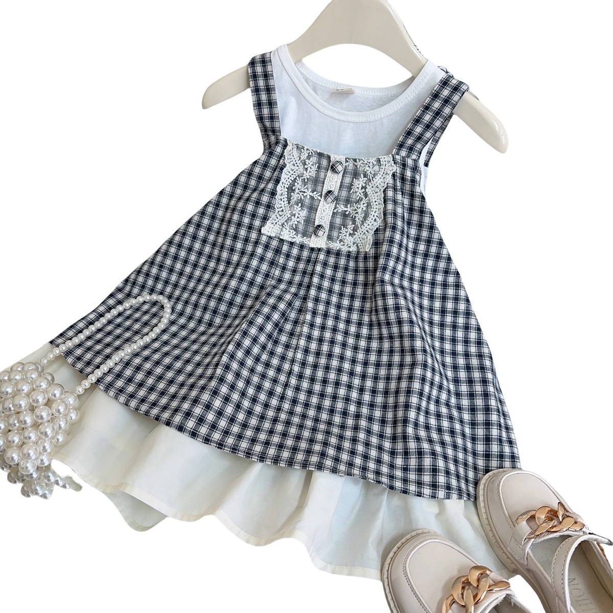 女童套装2025夏季新款森系小女孩背心T恤格子吊带裙公主两件套