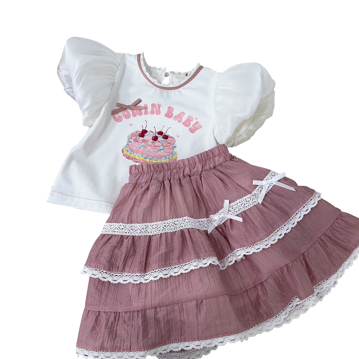 女童套装2025夏季新款小女孩短袖印花T恤+蛋糕裙两件套