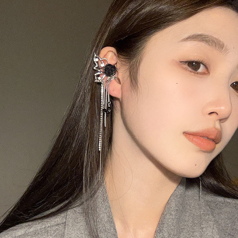 圣诞节暗夜精灵黑色玫瑰蝴蝶耳夹无耳洞长款流苏耳夹甜酷小众耳饰