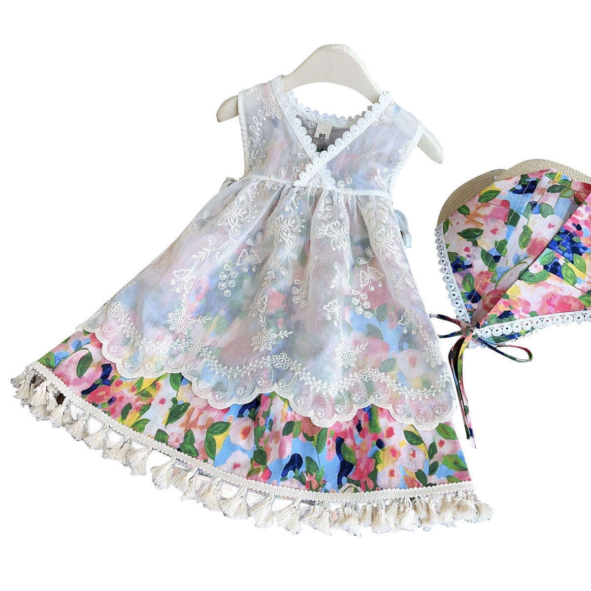 女童套装2025夏季新款女孩碎花吊带蕾丝连衣裙两件套送头巾