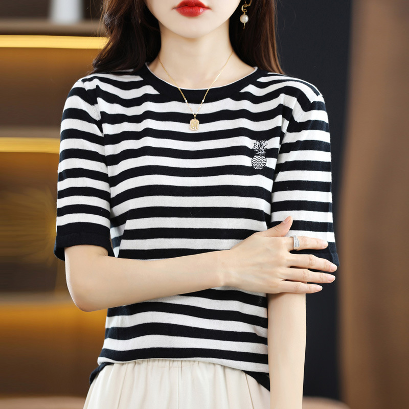女装夏季新款体恤冰丝条纹薄款高级感针织短袖恤女士上衣