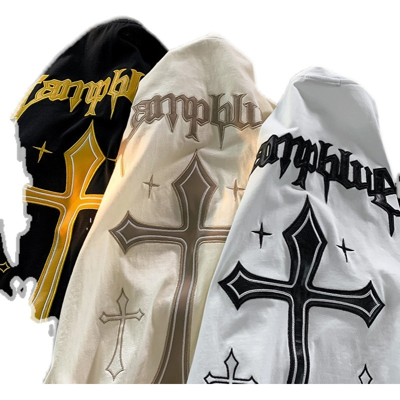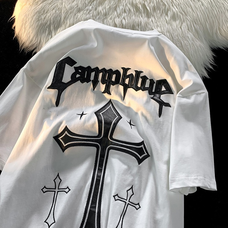 美式高街嘻哈十字架短袖t恤男女加肥特大码胖mm宽松含棉情侣上衣
