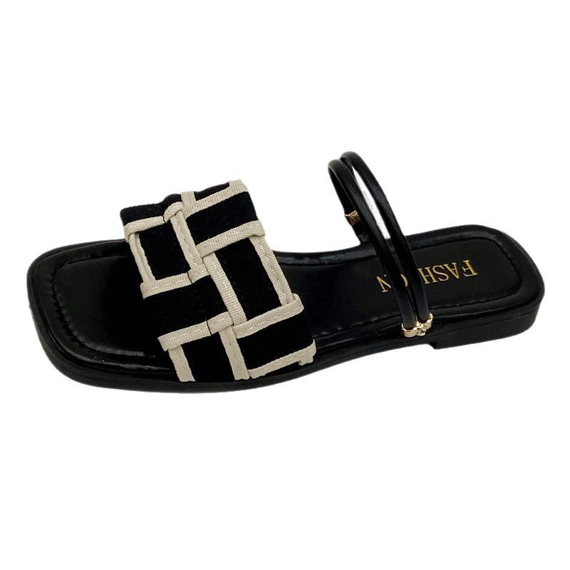 方头格子两穿凉拖鞋女外穿夏季新款韩版露趾平底简约沙滩凉鞋