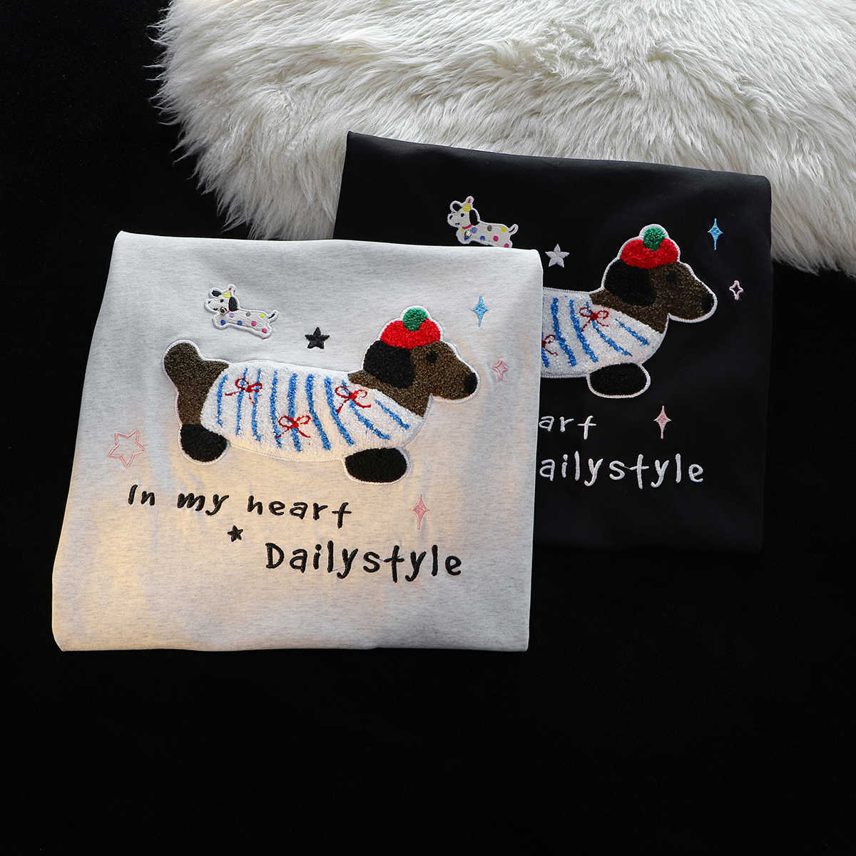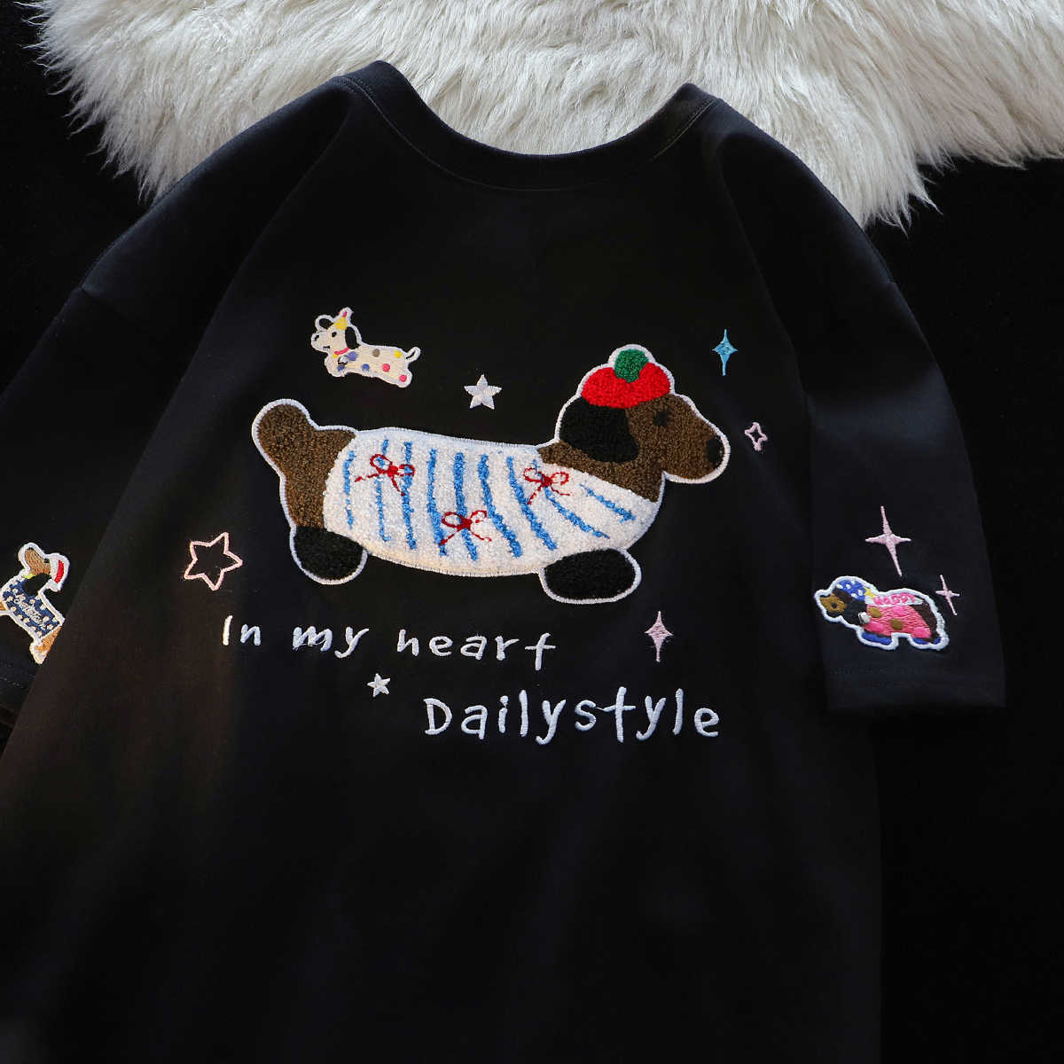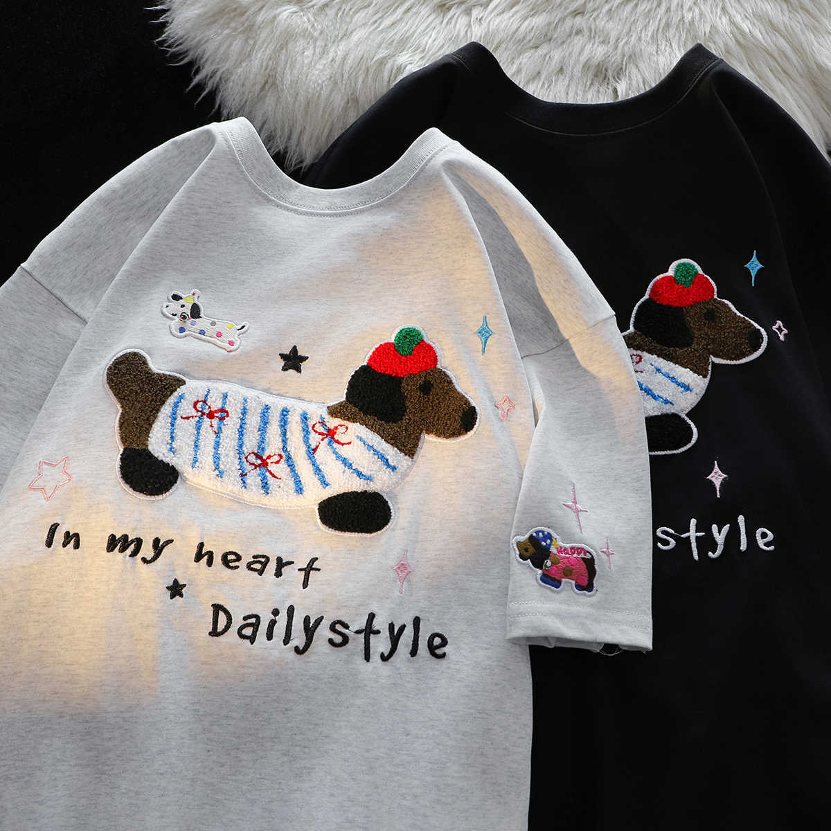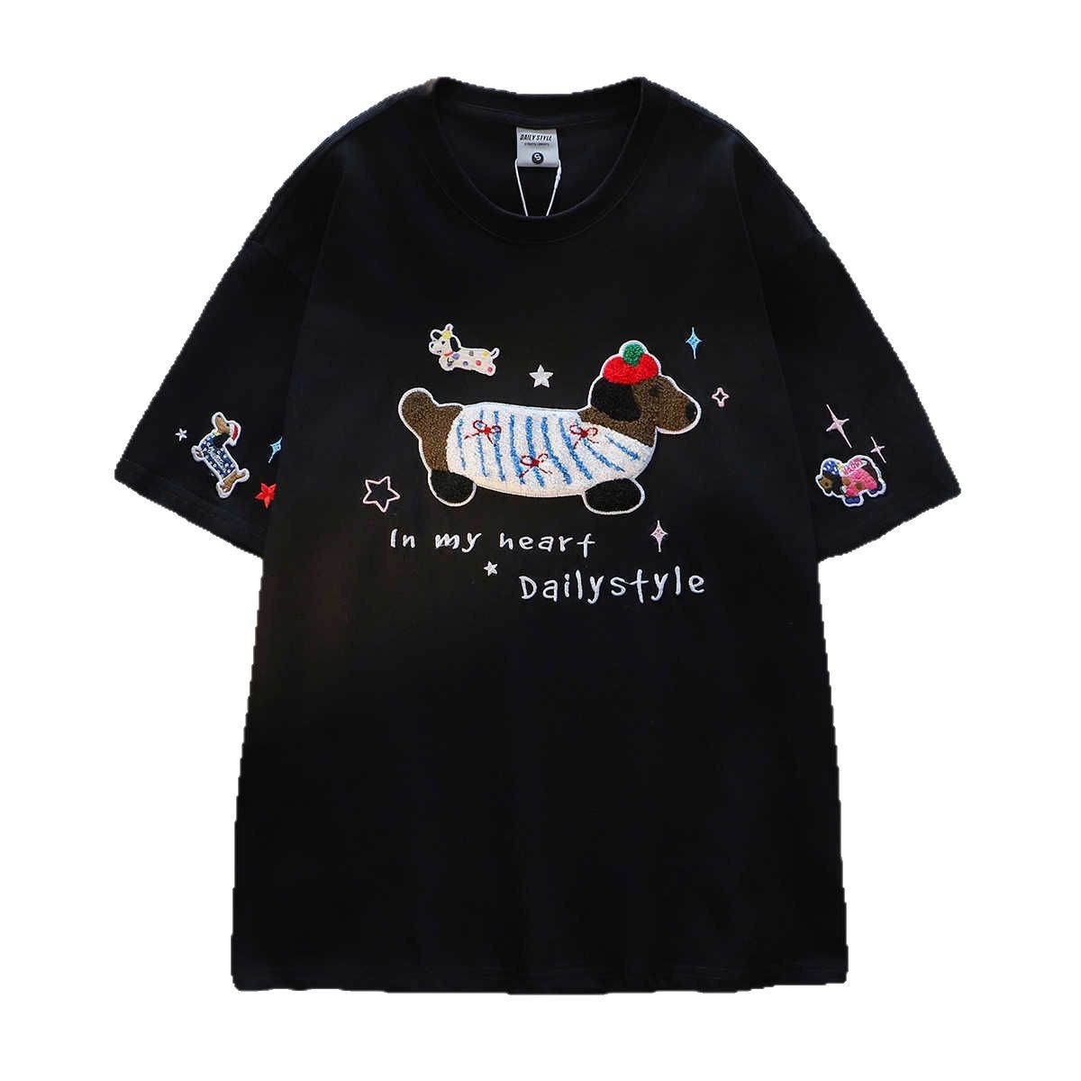 可爱毛巾绣小狗纯棉短袖t恤女夏季情侣宽松慵懒chic半袖甜酷上衣