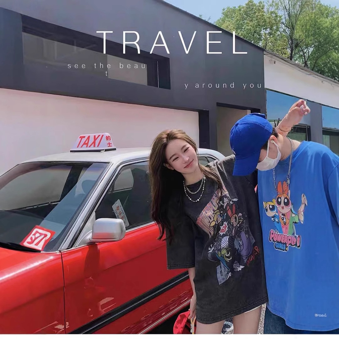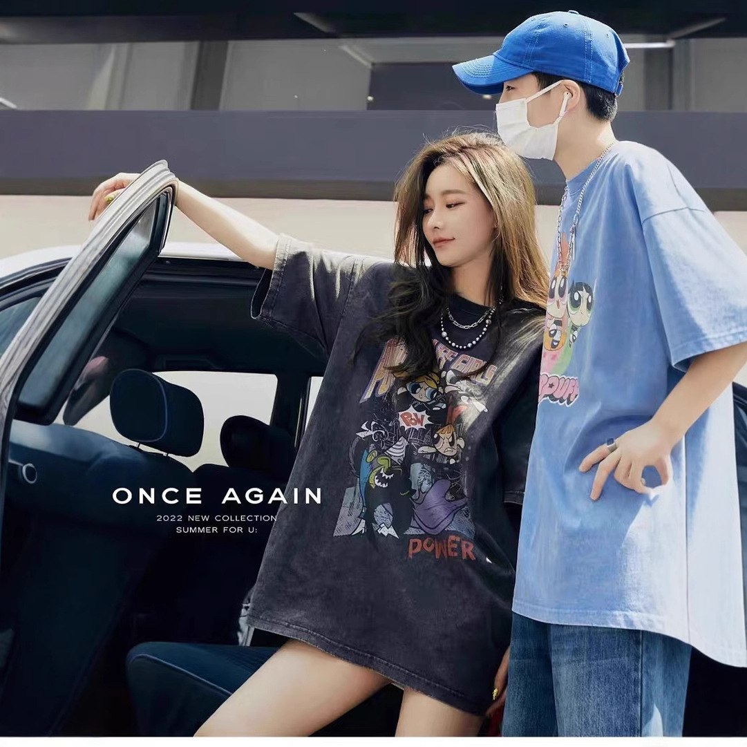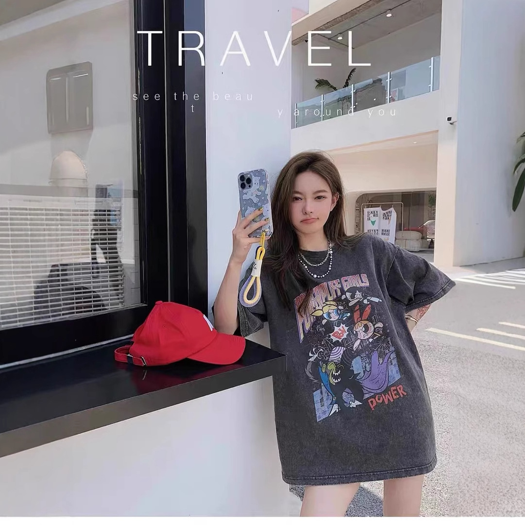 2025新款卡通做旧水洗中长款短袖T恤女夏潮款复古宽松情侣款上衣