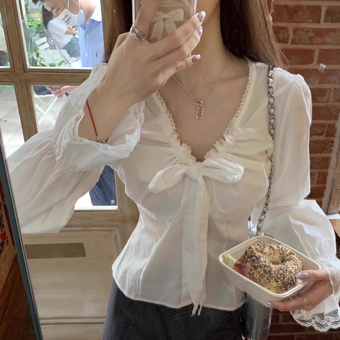 白色收腰衬衫女春秋新款法式花边蕾丝v领设计感长袖显瘦别致上衣