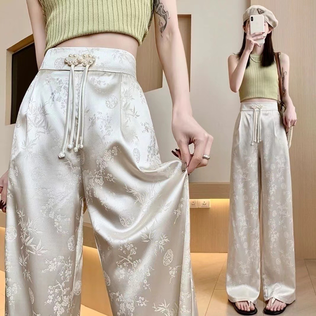 现货新中式国风缎面提花阔腿裤女春夏新款高腰显瘦垂感休闲拖地裤