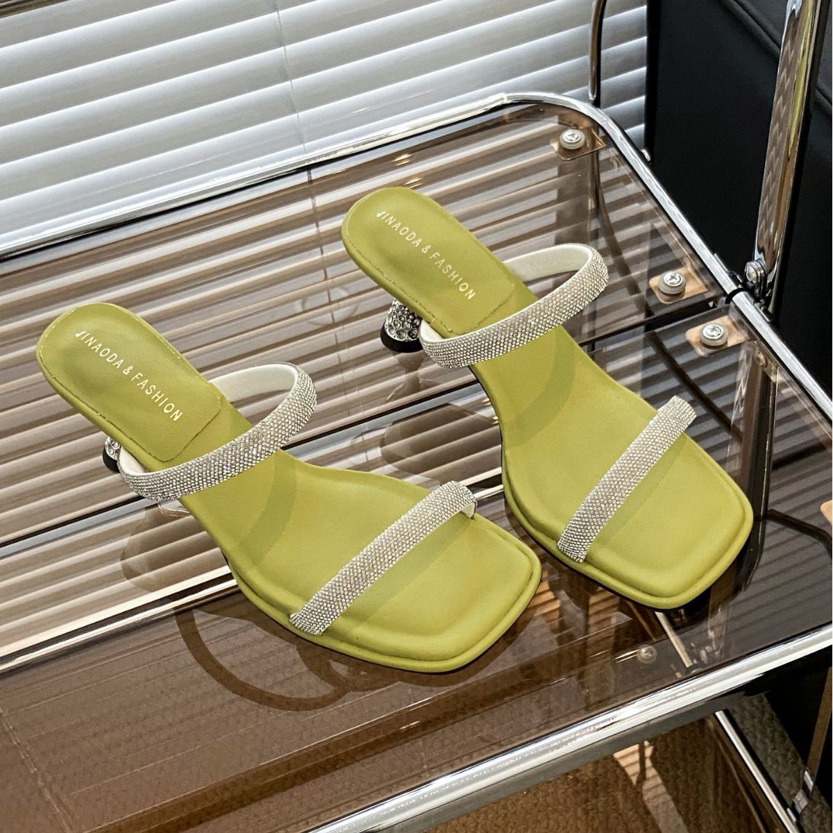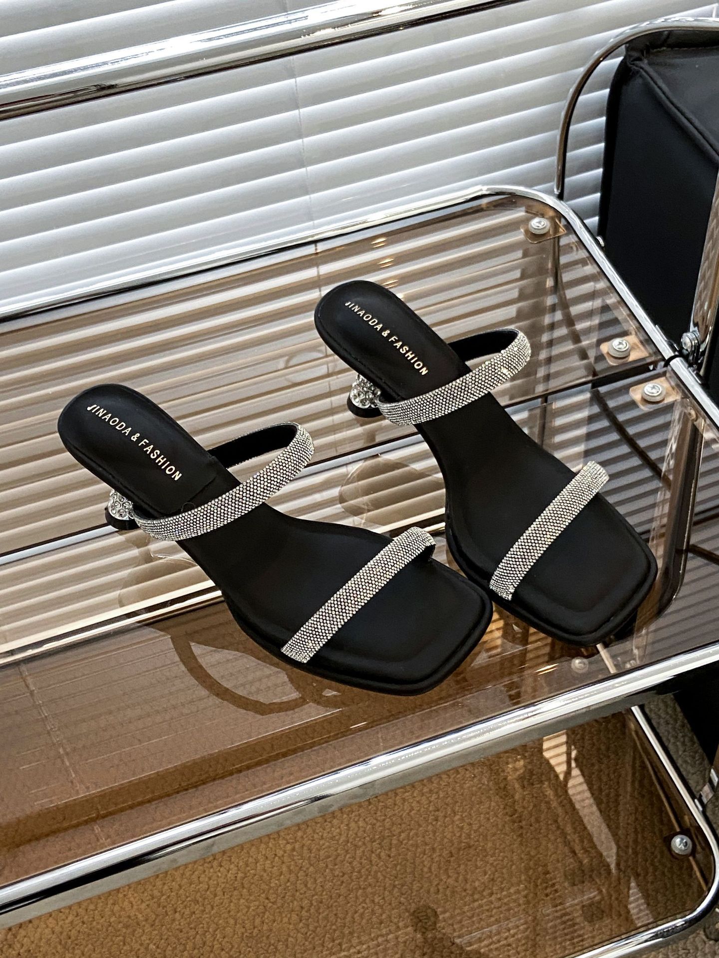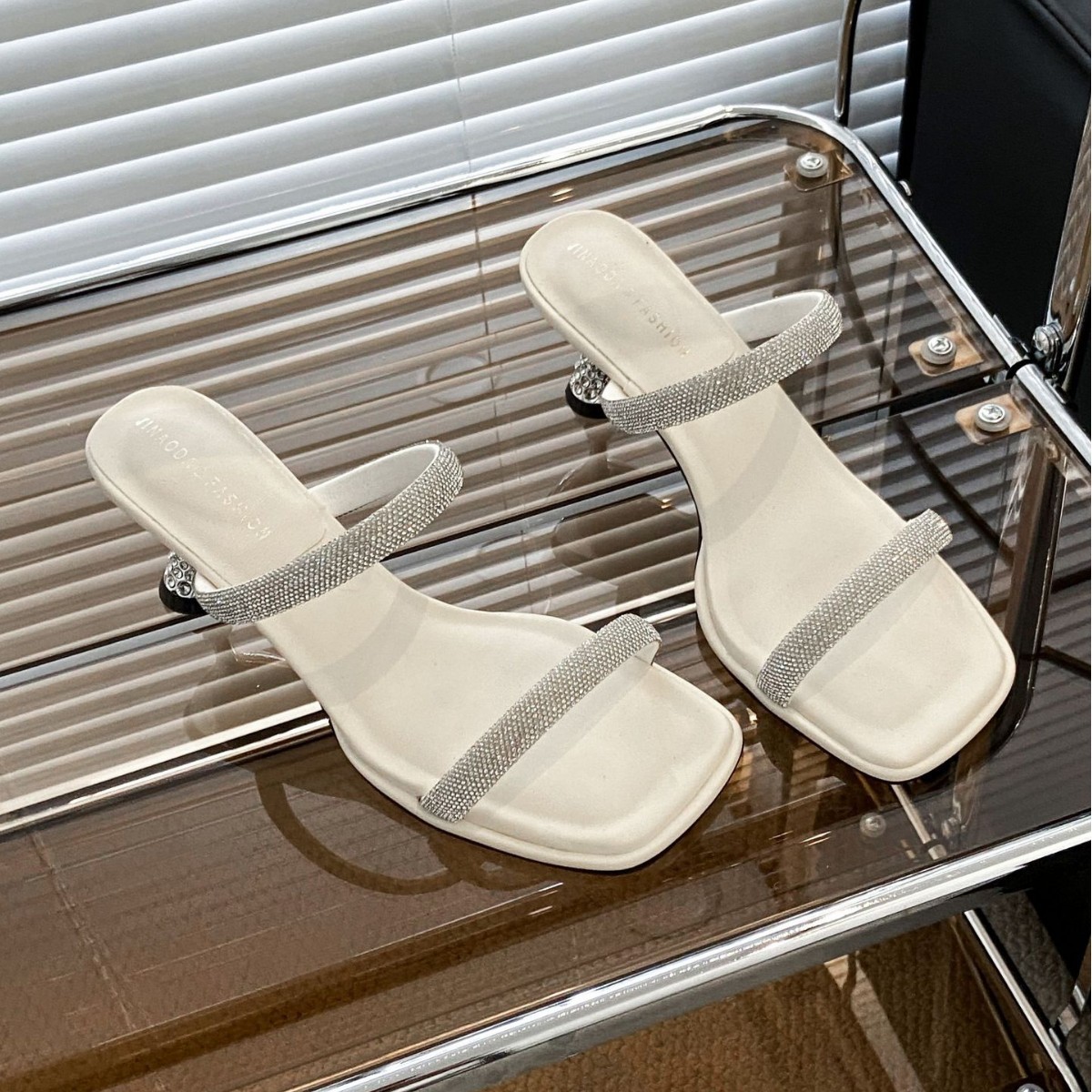 欧洲站高跟金属细跟凉拖鞋2025年新款夏绝美仙女水钻方头一字拖鞋