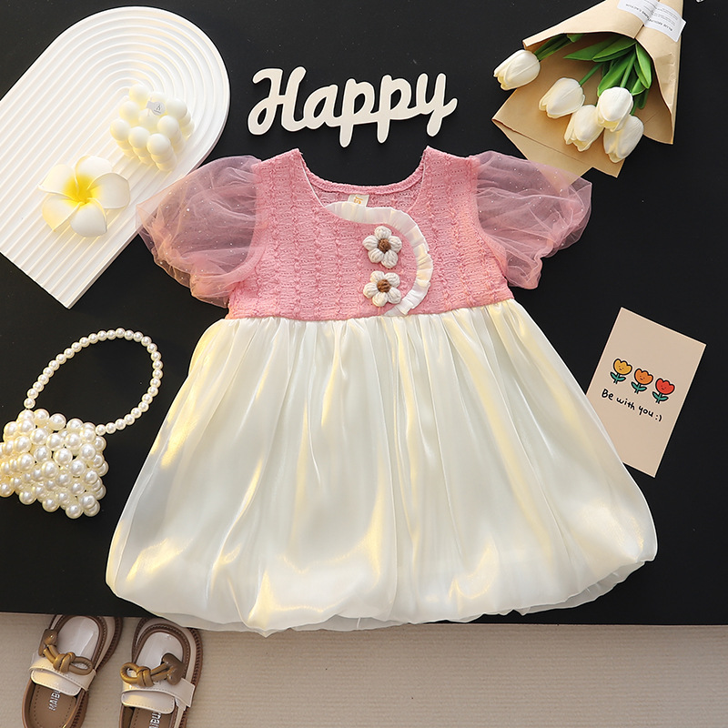女童连衣裙夏季新款网纱短袖流光纱裙洋气中小童两色圆领公主裙