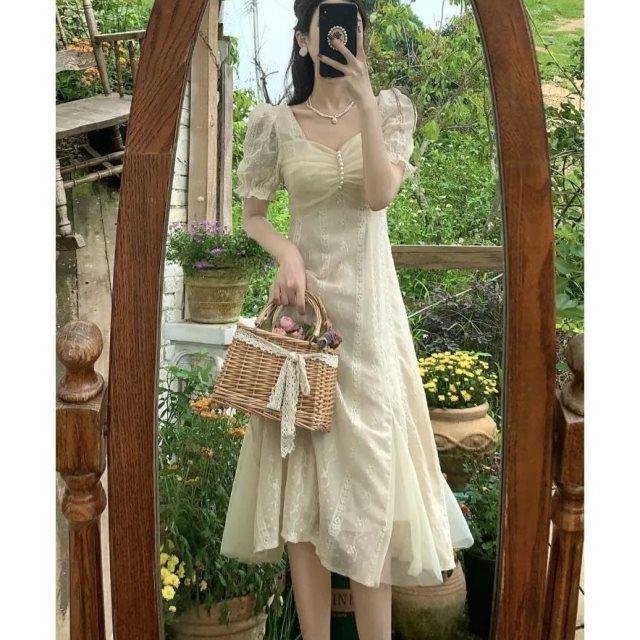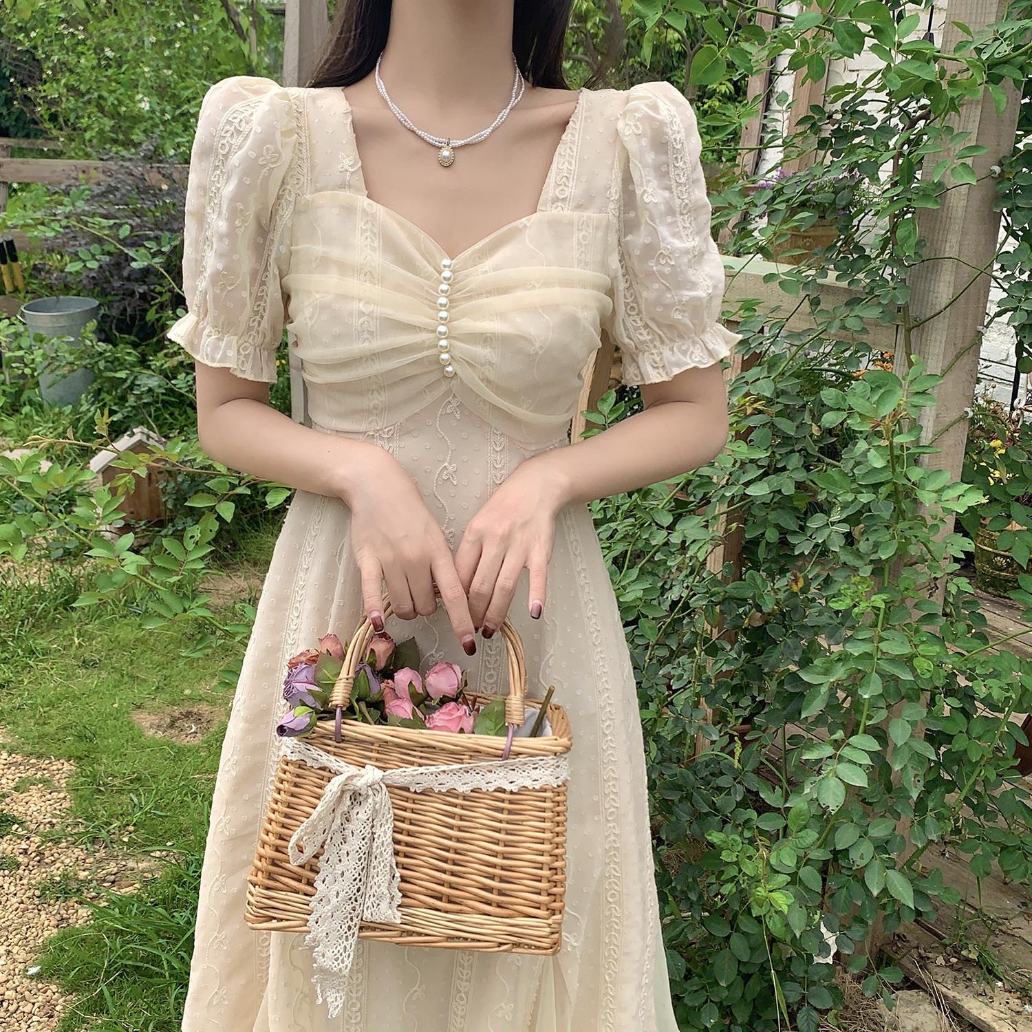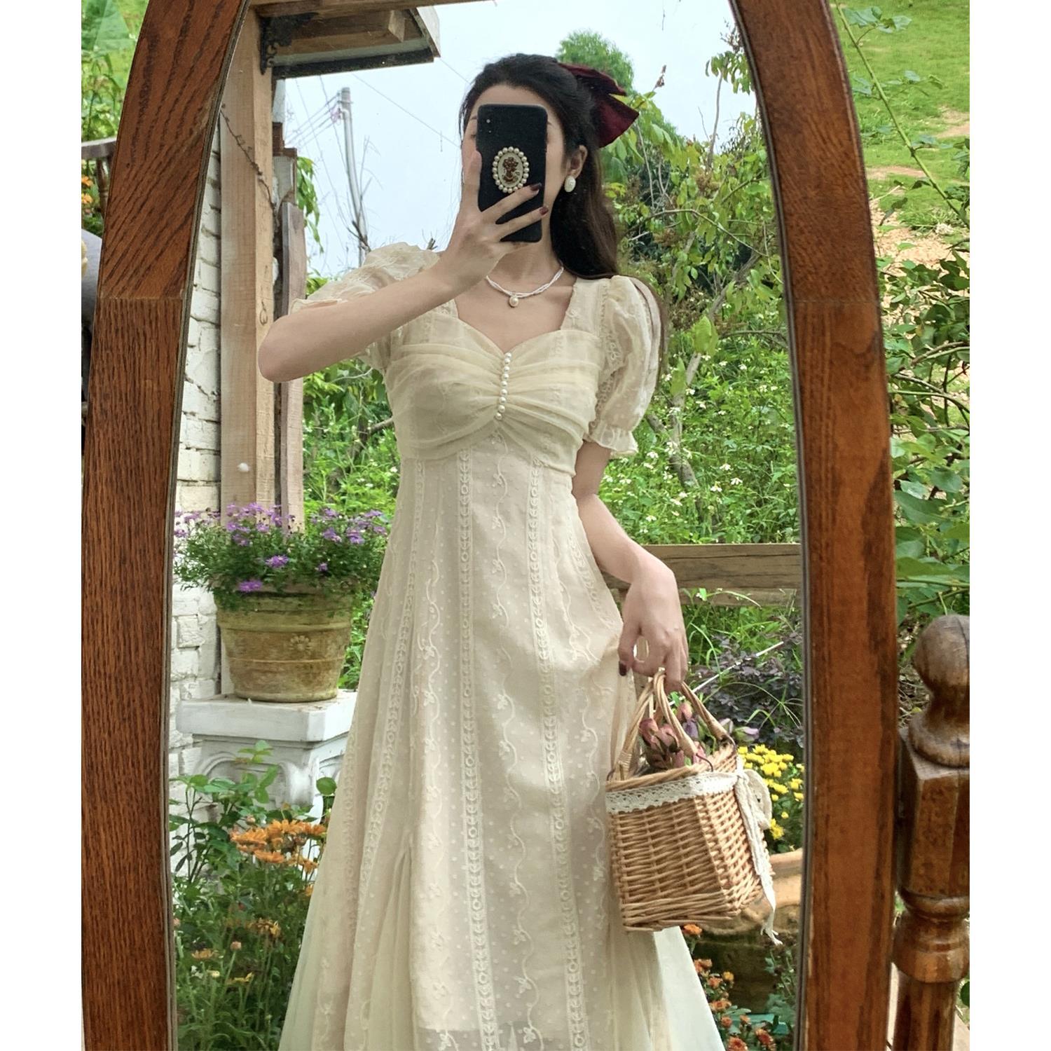 方领夏装甜欲风初恋茶歇法式连衣裙桔梗复古设计感森系连衣裙女装