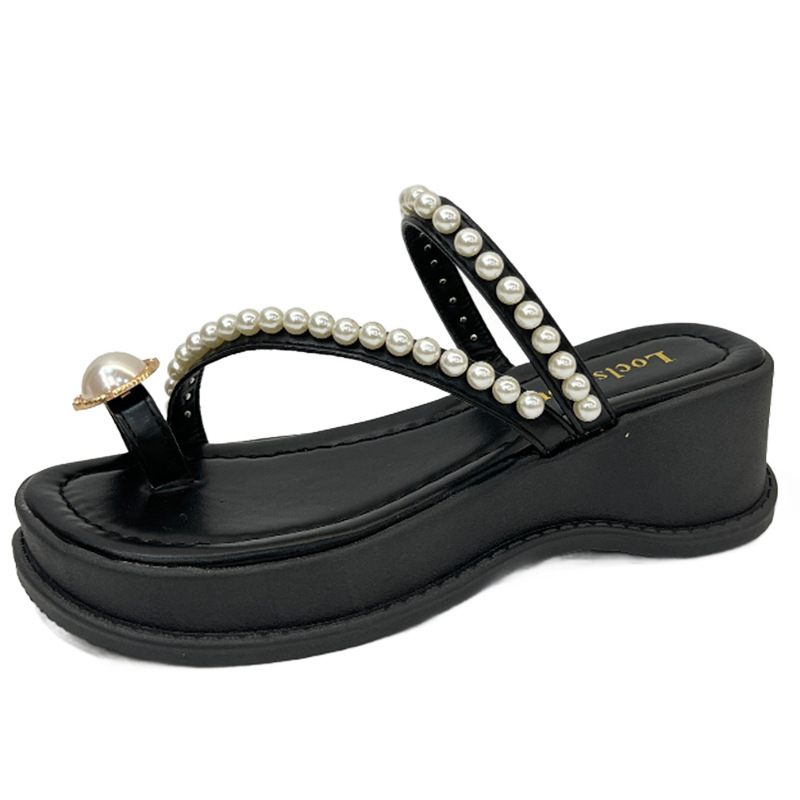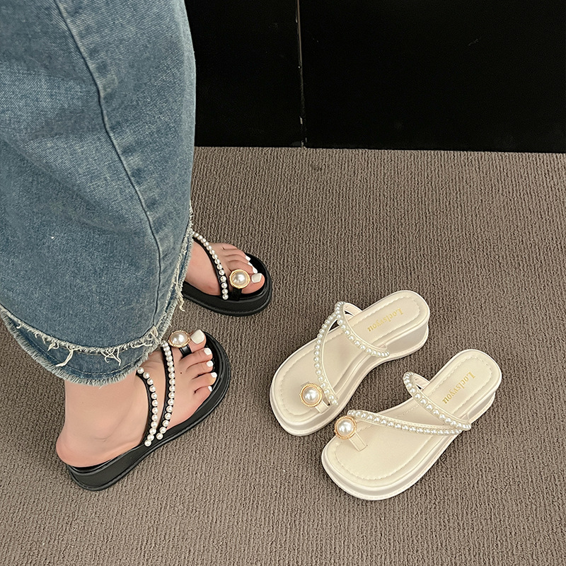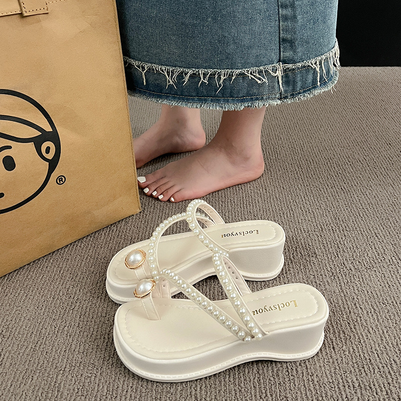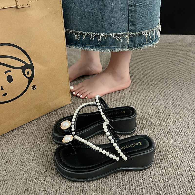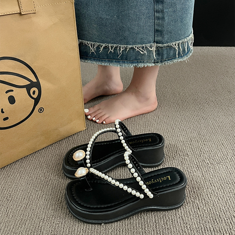 2025夏季新款百搭仙女风珍珠时尚松糕厚底凉鞋女夹脚凉拖鞋女外穿
