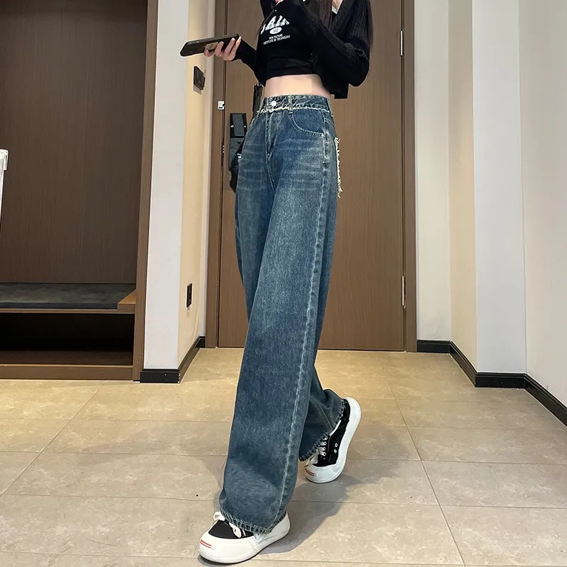 阔腿牛仔裤女网红毛边高腰宽松直筒裤小个子拼色口袋设计感拖地裤