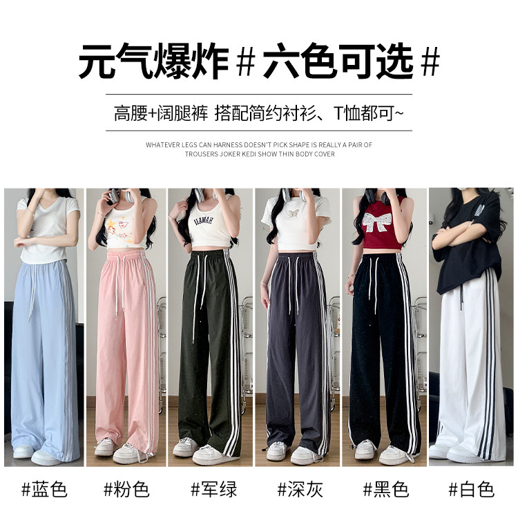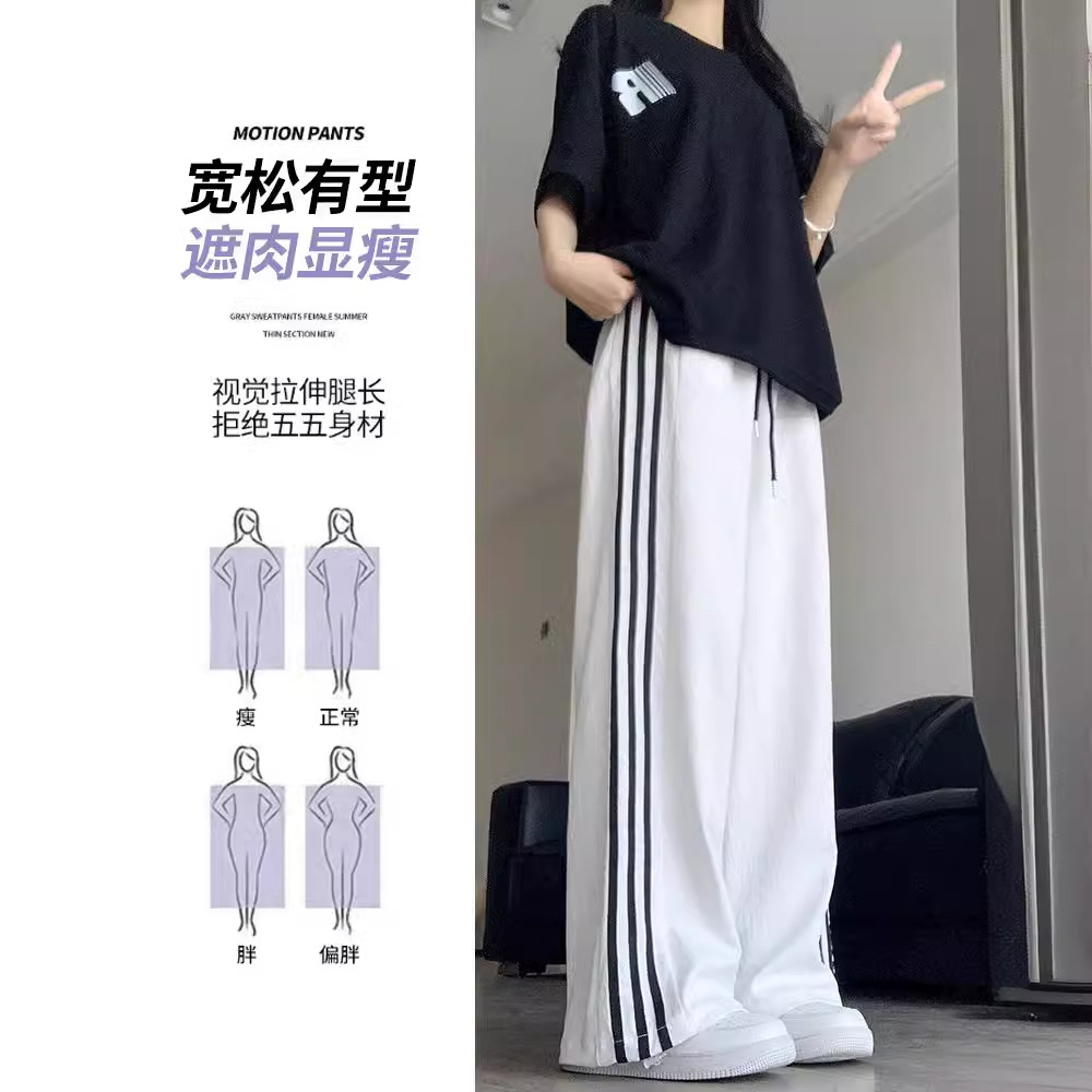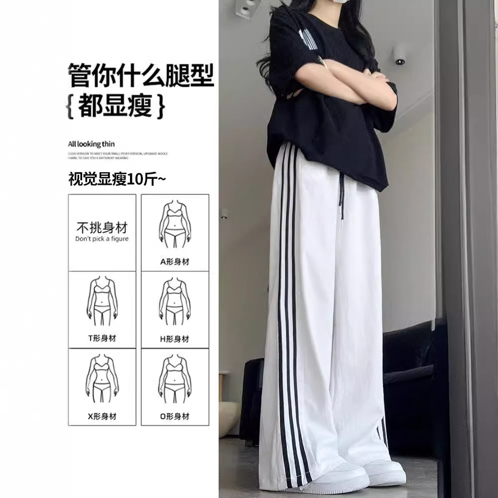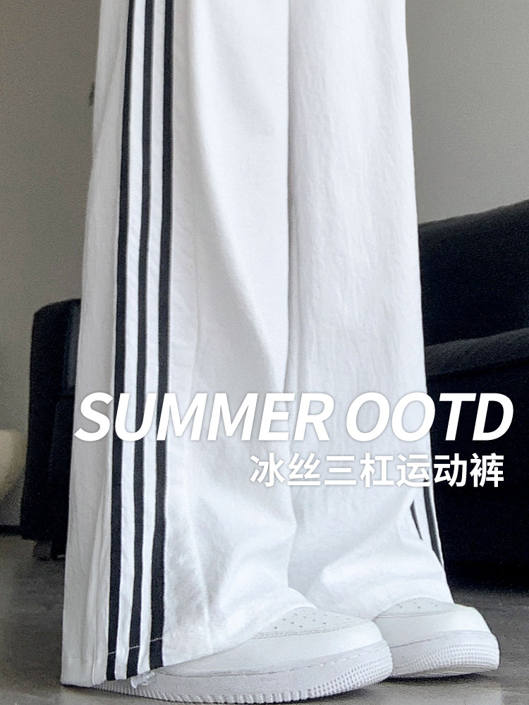 白色速干运动裤女夏季冰丝防蚊防晒裤高腰垂感直筒侧条纹阔腿裤子