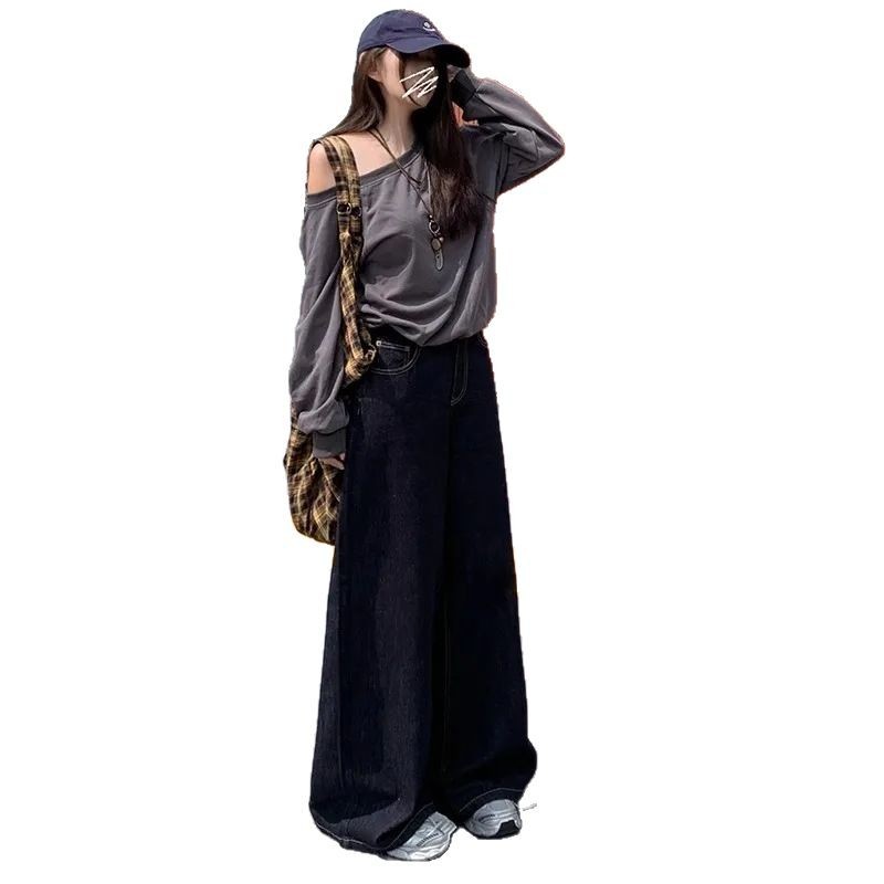 深蓝色复古垂感阔腿牛仔裤女2025秋季新款高腰显瘦宽松直筒拖地裤
