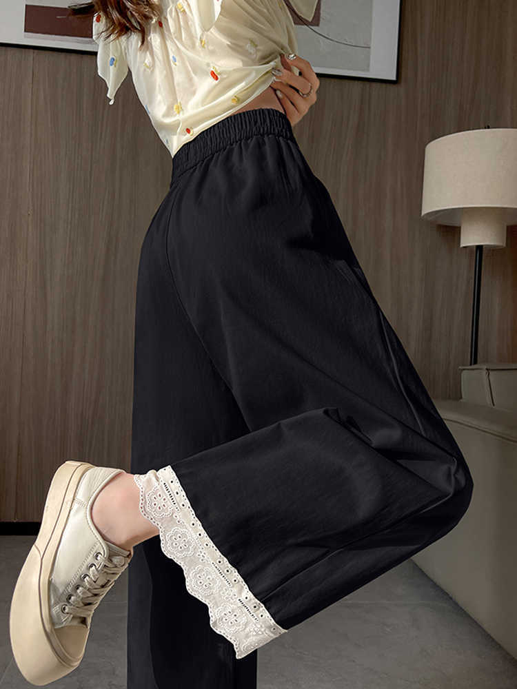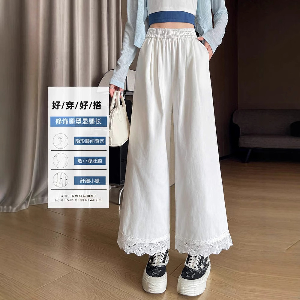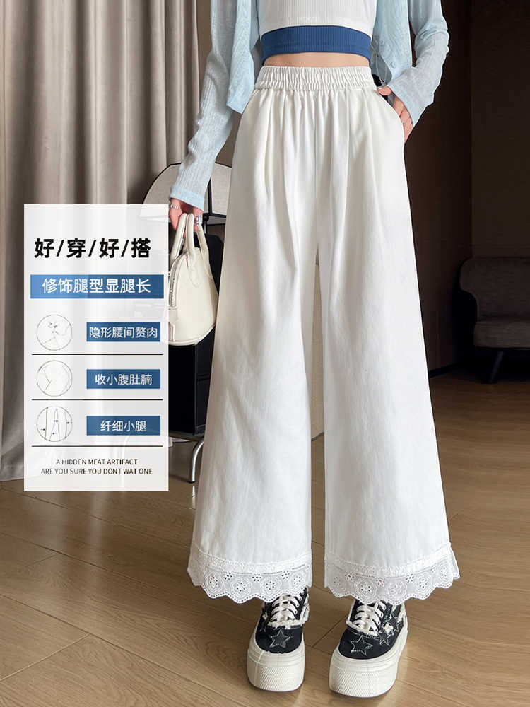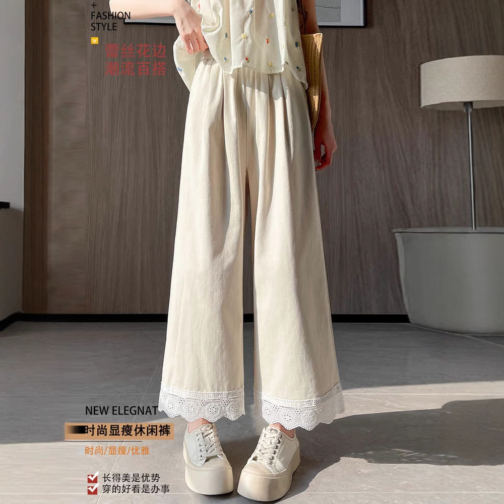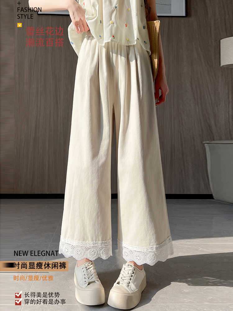 蕾丝花边洗水棉阔腿裤女夏季高腰垂感直筒宽松休闲小个子九分裤子