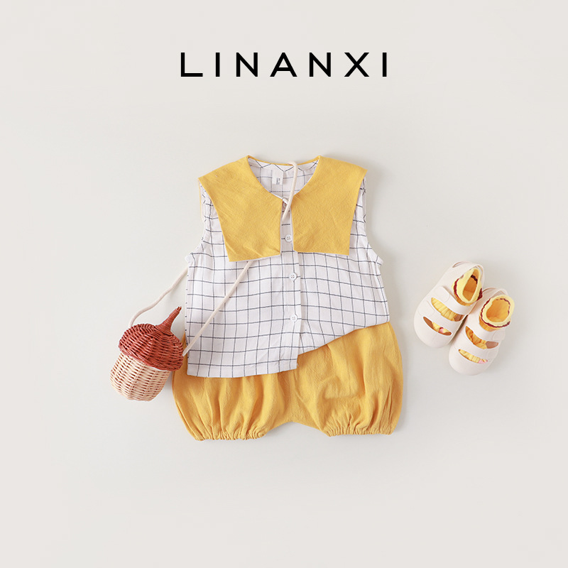 24新夏款男女童套装纯棉色织格子宝宝两件套方领短袖衬衣+南瓜裤