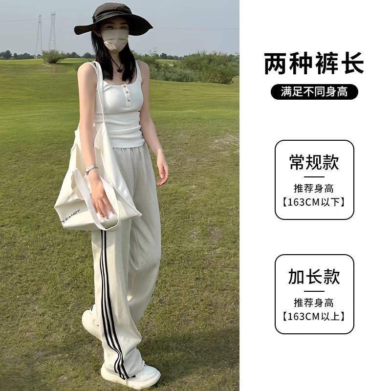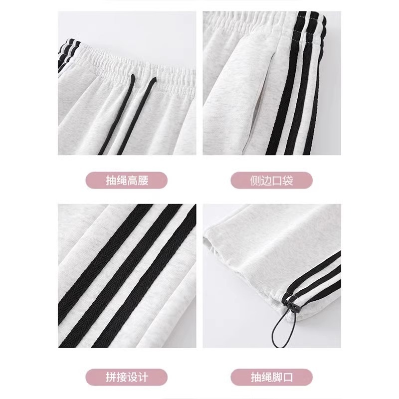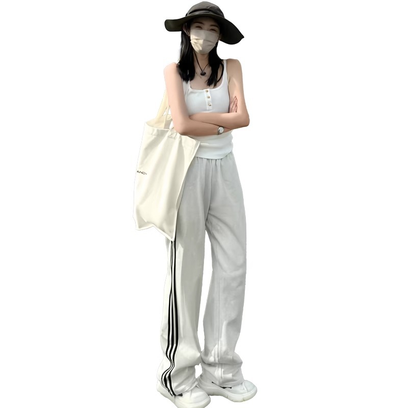 白灰色两穿运动裤女秋季新款显瘦阔腿裤宽松三条杠休闲卫裤子
