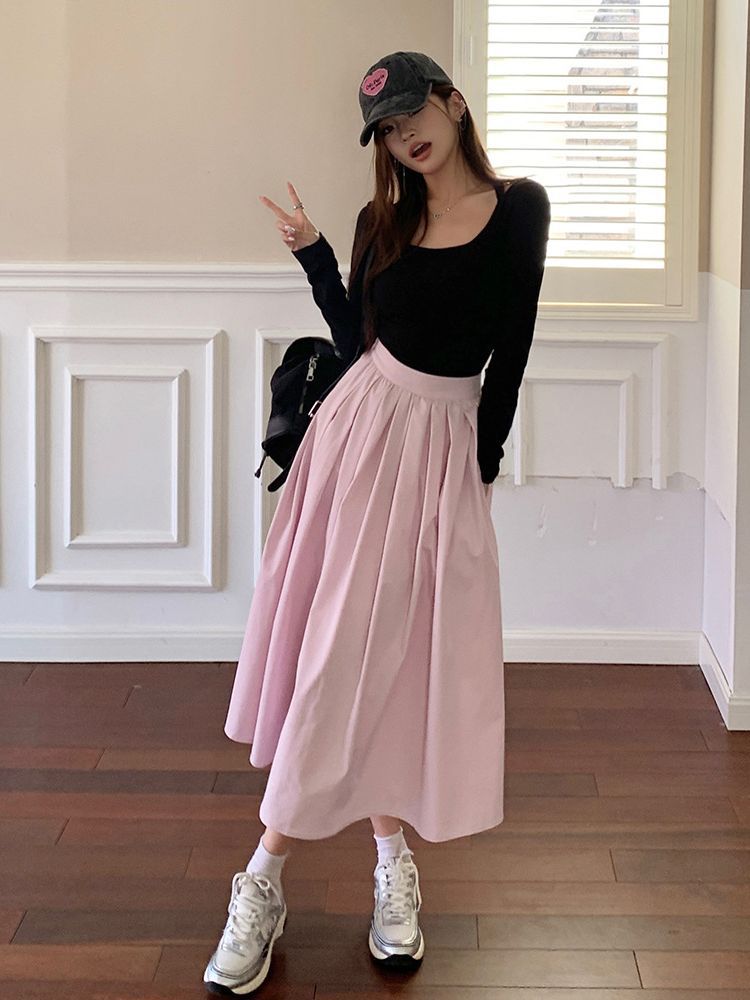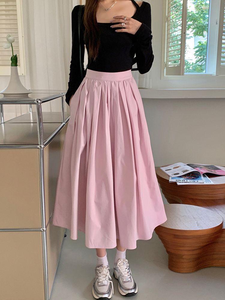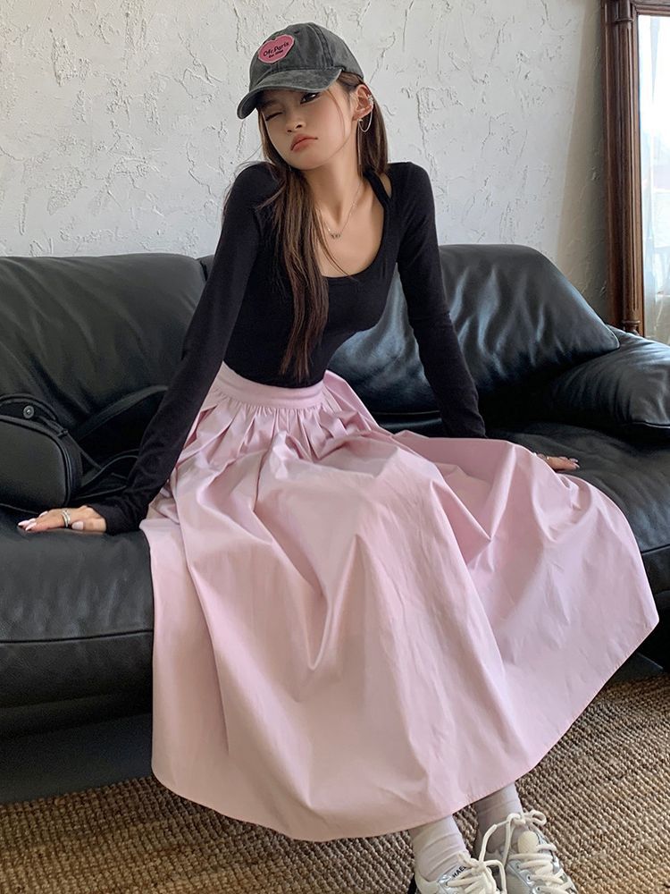 粉色高腰显瘦中长款a字半身裙女春夏小众设计感气质百搭伞裙