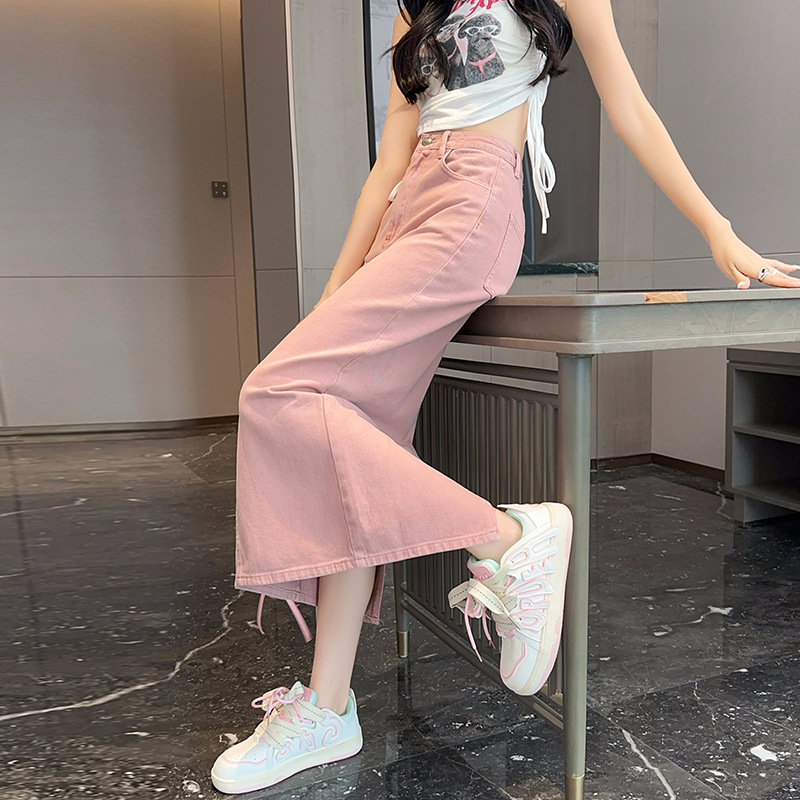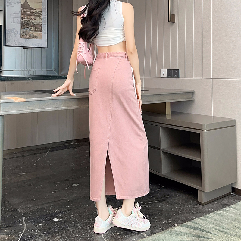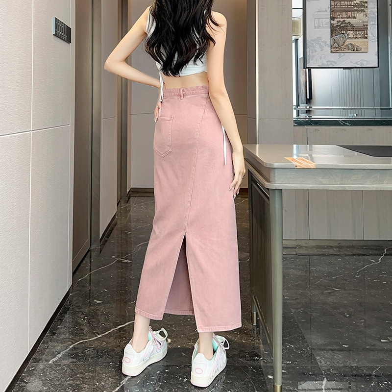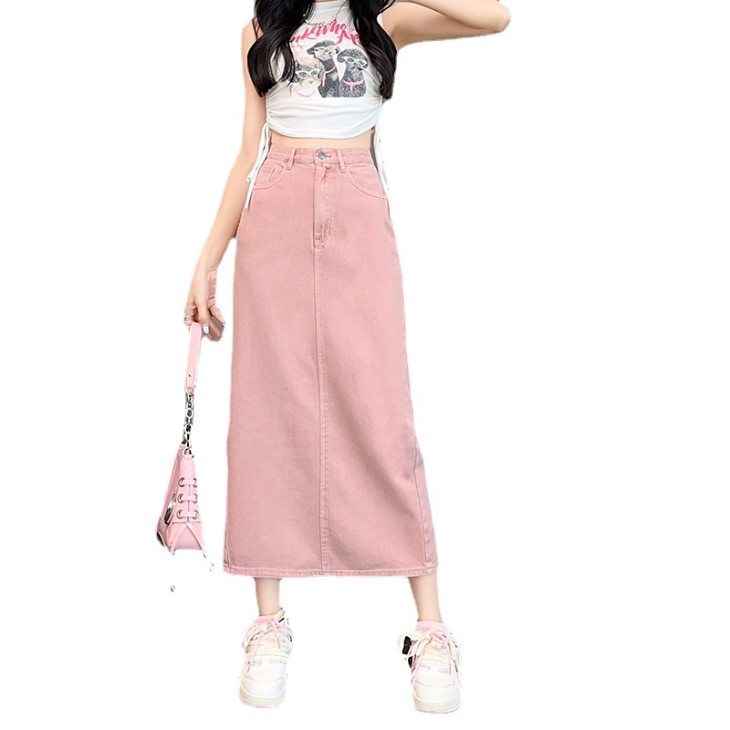 粉色a字中长款显瘦后开叉包臀裙子牛仔半身裙女春夏辣妹潮高腰裙