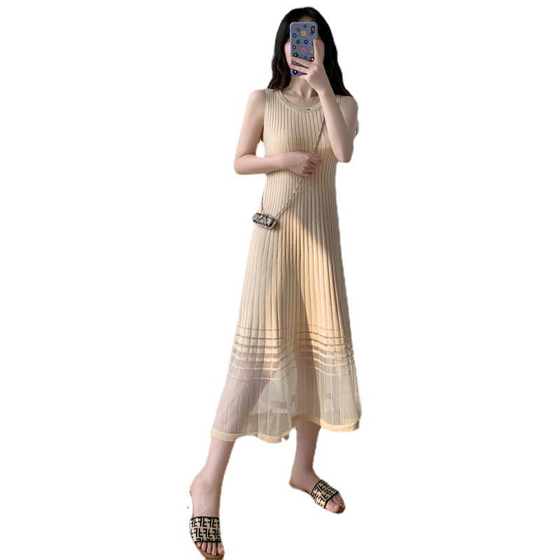 春夏圆领背心连衣裙女夏修身显瘦a字裙冰丝无袖打底针织长裙