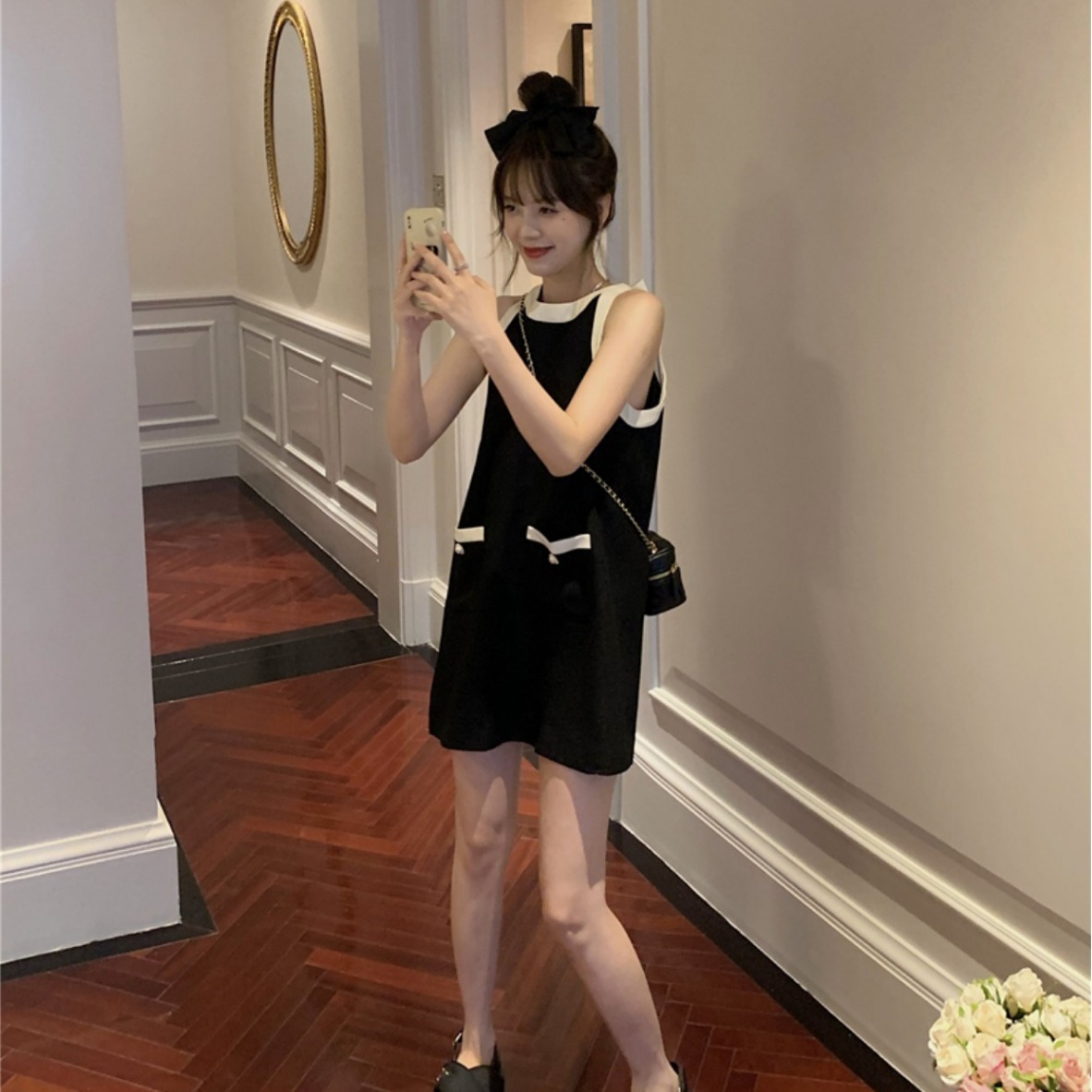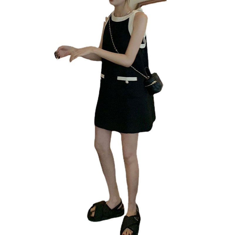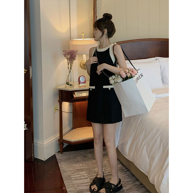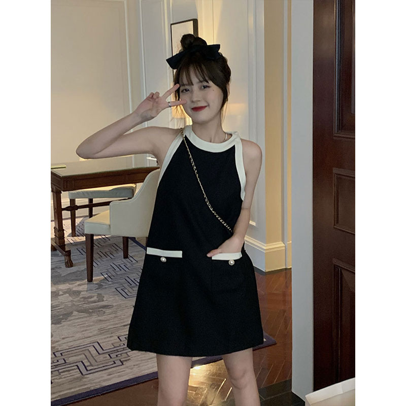 小香风无袖挂脖背后系带a字连衣裙春夏女气质小众设计小个子裙子
