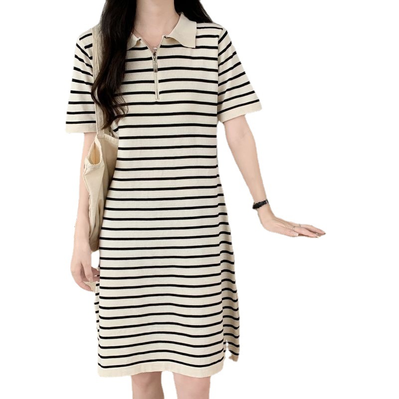 春夏复古条纹针织连衣裙女韩版Polo领气质宽松a字裙小个子裙子潮